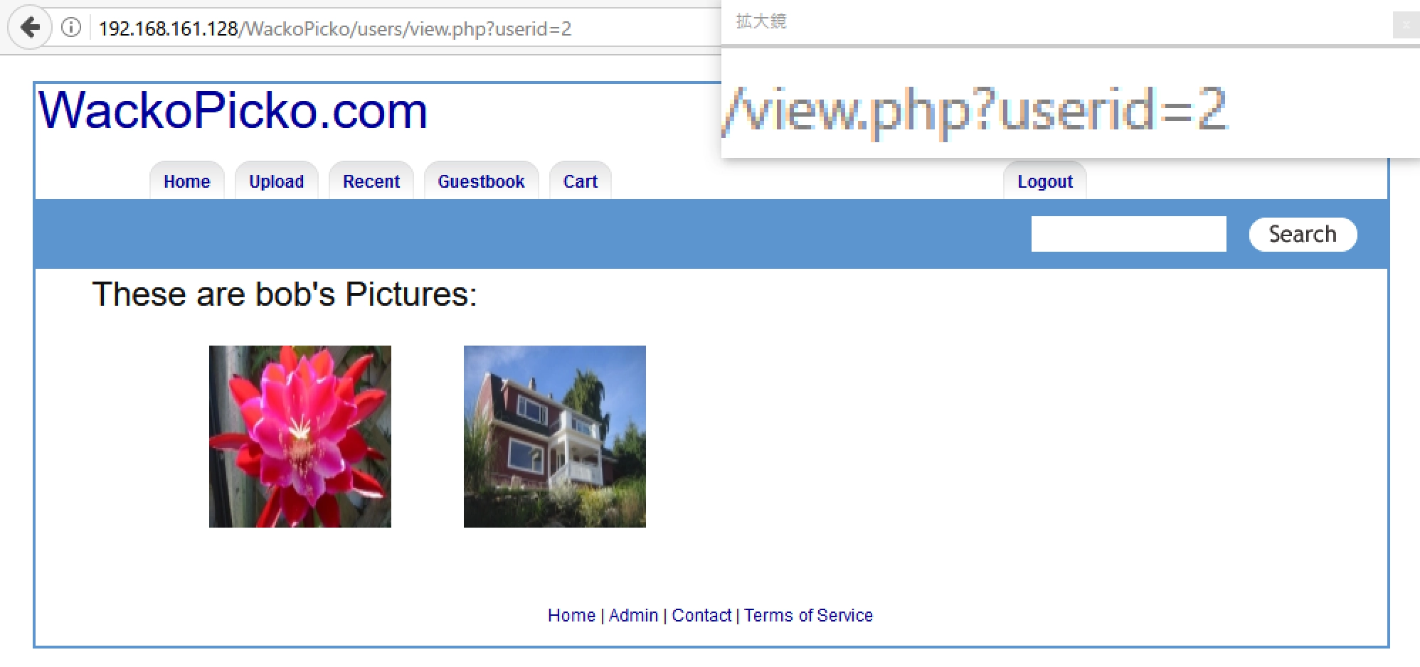 図1はユーザー「bob」がアップロードした写真の一覧ページ /view.php です。このページではURLに付与されたパラメータ userid でユーザーを識別しているようです。ユーザー「bob」のIDは 2 です。