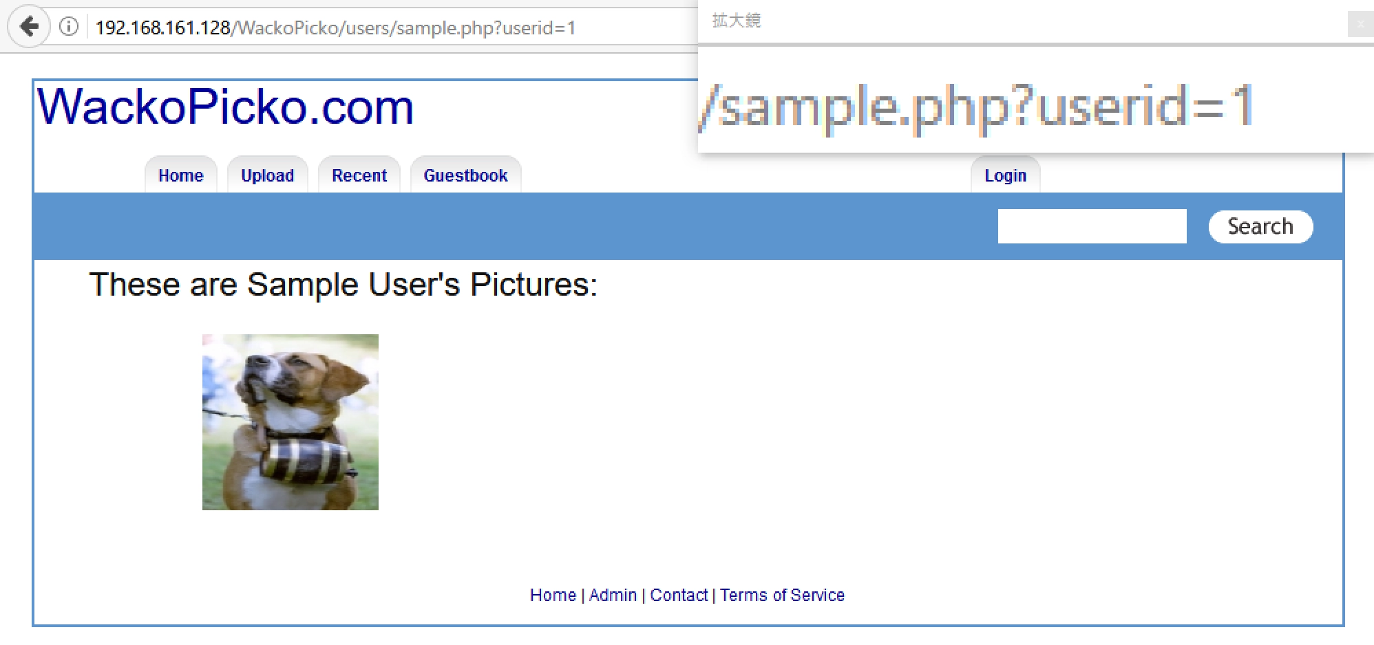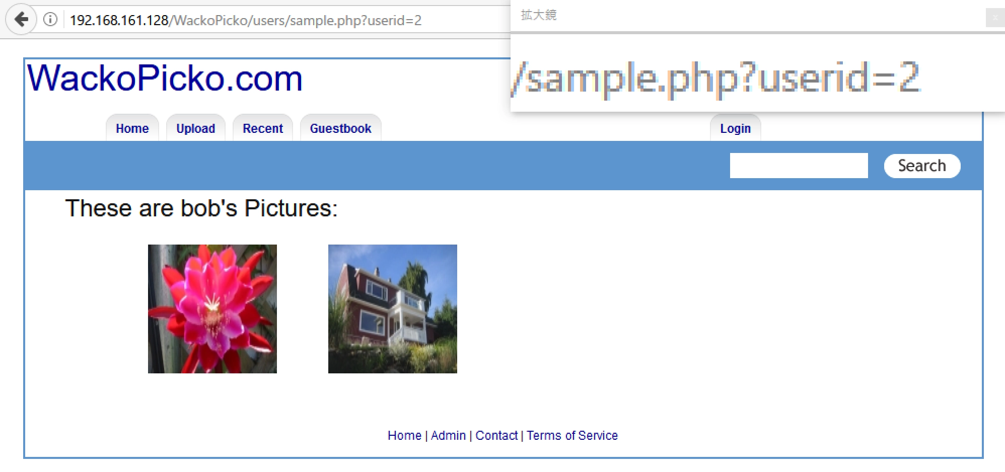 サンプルページのURLにもパラメータ userid が付与されています。サンプルユーザーのIDは 1 です。このIDを操作することで特定のユーザーがアップロードした写真を表示できそうです。IDを 2 に付け替えてアクセスすると、ユーザー「bob」の写真が表示されました。