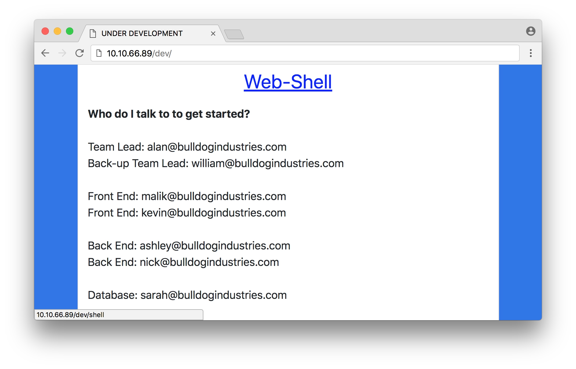 Niktoのスキャンにより OSVDB-3092: /dev/: This might be interesting... という問題が検出される。これは /dev/ という開発用と推測されるディレクトリが公開されているとの報告である。ブラウザからアクセスすると開発者向けのページが表示される。ページ内には開発者のメールアドレスが記載されている。