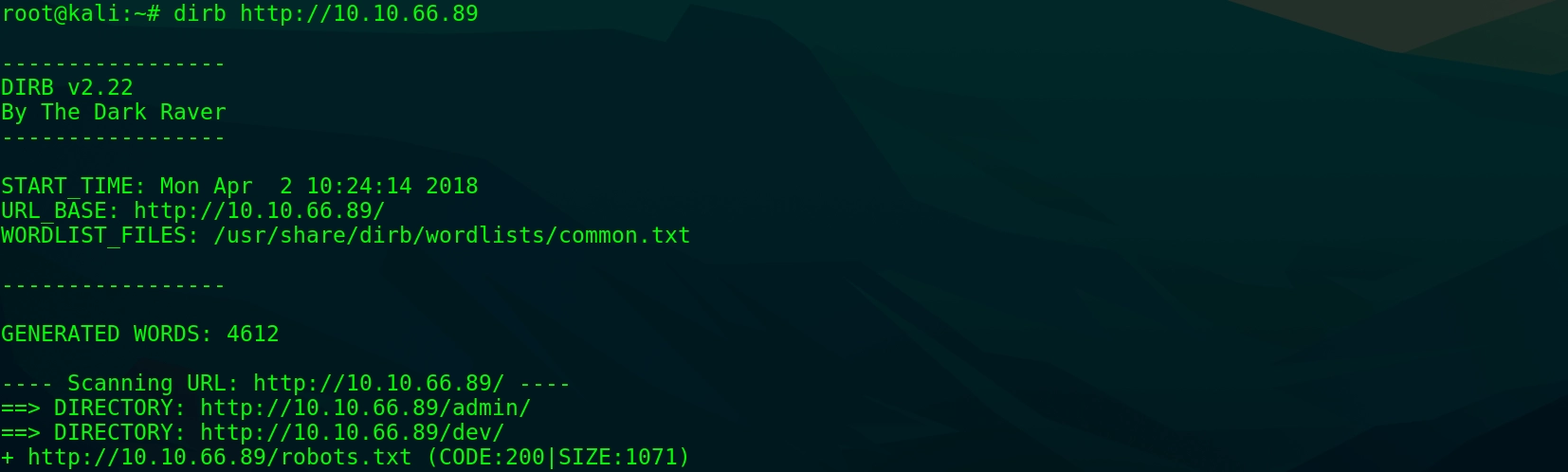 サイト内にはログインページが見当たらないため、特定したパスワードの用途が不明である。そこでNiktoよりもコンテンツ探索に特化したDIRBでWebサーバをスキャンする。
