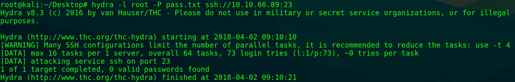 SSH接続するとパスワード認証を求められるので、パスワードリストを用いたユーザー root の総当たりをTHC-Hydraで試みるが失敗に終わる。