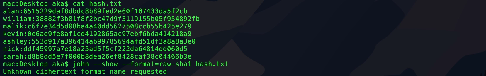 文字列は40文字であり、数字と a から f までの英字で構成されていることから、開発者ごとのパスワードをSHA-1でハッシュした値だと推測される。John the Ripperによるパスワードの解析を試みるが、Mac上では Unknown ciphertext format name requested とのエラーが発生する。
