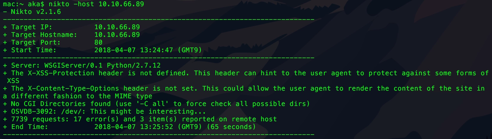 80番ポートではWebサーバが動作しているので、Webサーバ向けのセキュリティ診断ツールであるNiktoでスキャンする。