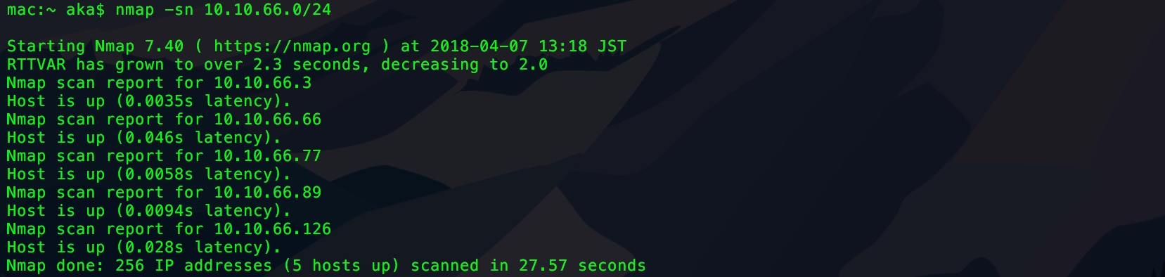 まずは対象のネットワークに存在する端末を把握するため、ネットワーク調査ツールであるNmapを使用してネットワーク全体をスキャンする。端末を検出するため -sn オプションを付けて実行すると、5台の端末が見つかる。