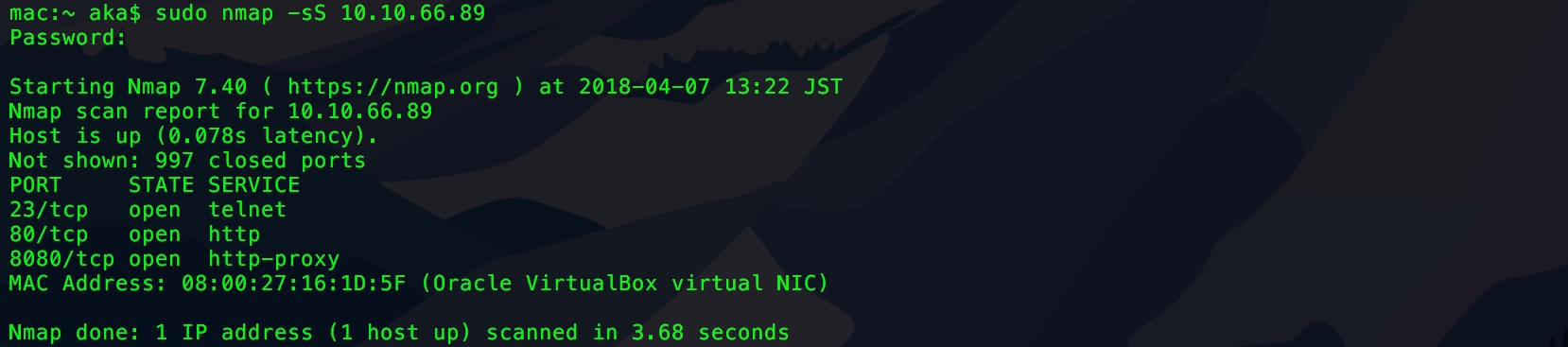 検出した端末に対してNmapによるポートスキャンを実施する。-sS オプションを付けてTCP SYNスキャンを実行すると、3つのオープンポートが検出される。