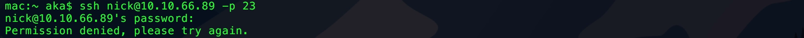 特定したパスワード bulldog を用いてユーザー nick でのSSHログインを試みるが失敗する。