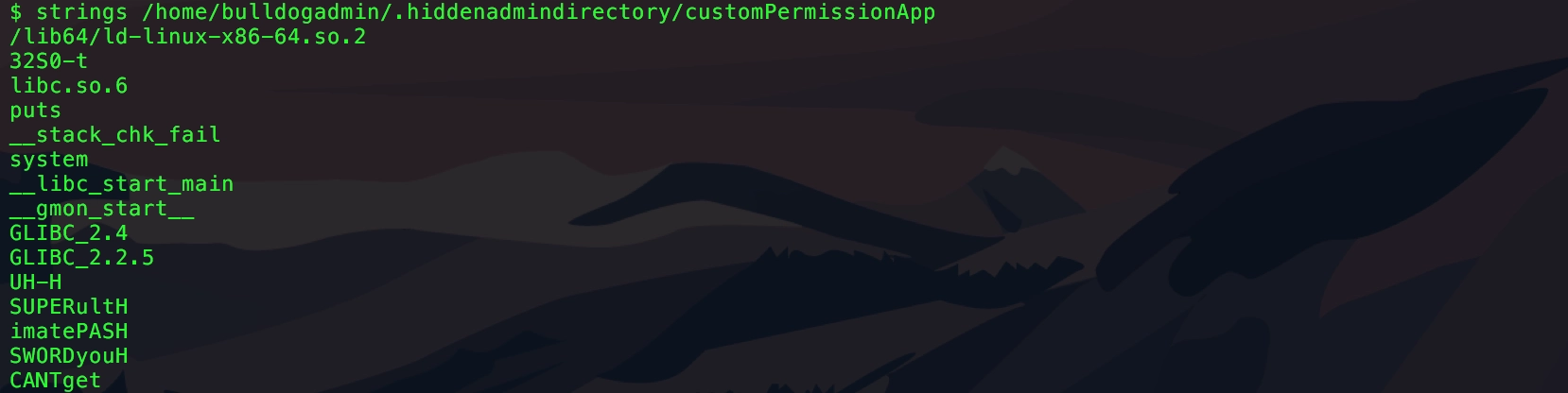 root権限の奪取には /.hiddenadmindirectory/ という隠しディレクトリ配下のファイル内の文字列を利用する。strings コマンドで抽出した中の4つの文字列を連結し、そこから H を削除した文字列がrootのパスワードであった。