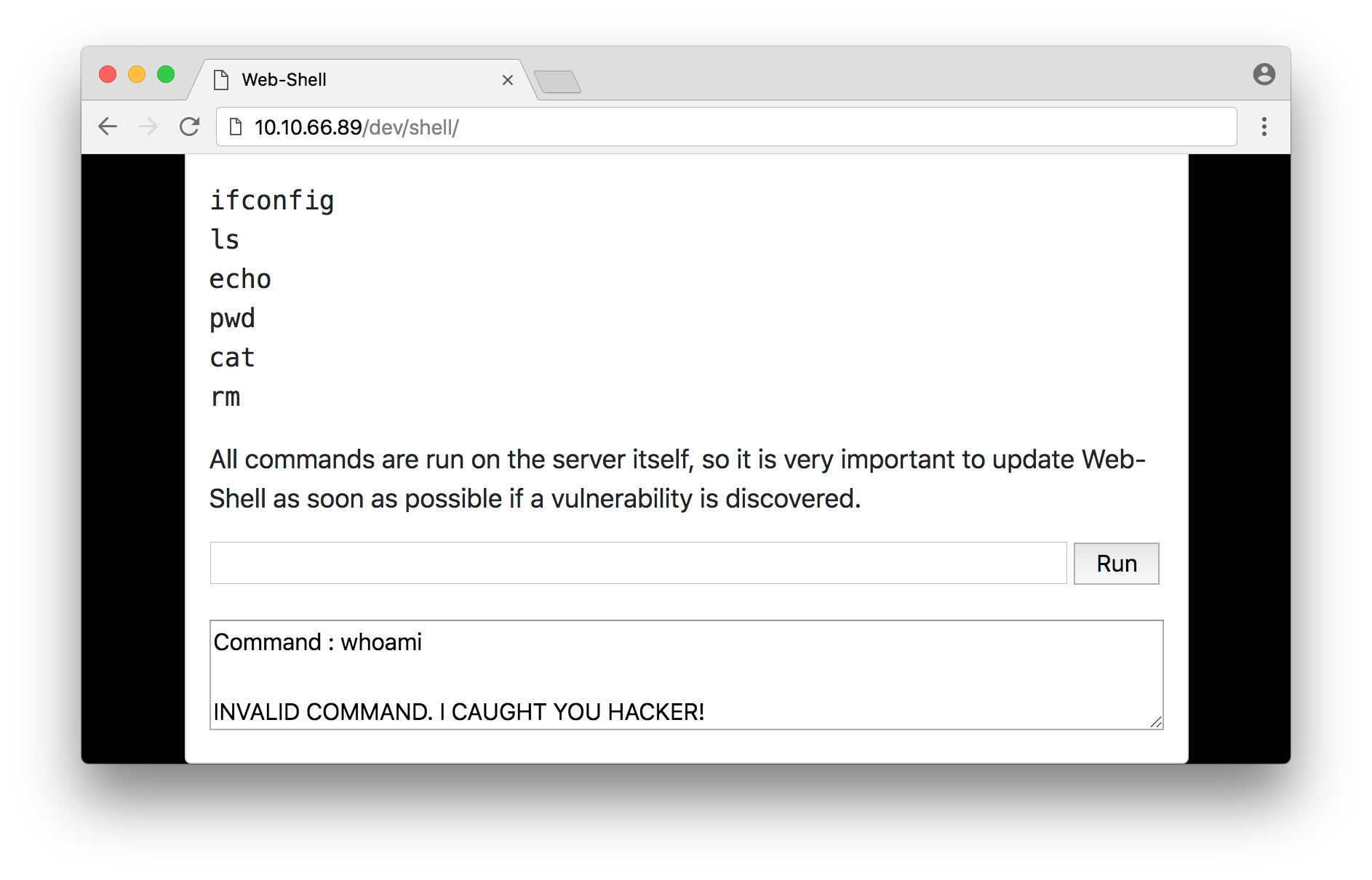 開発者としてログインした状態であればWebShell機能を利用できる。しかし実行できるコマンドは ifconfig、ls、echo、pwd、cat、rm のみに制限されている。許可されていないコマンドを入力するとハッカーと疑われてしまう。