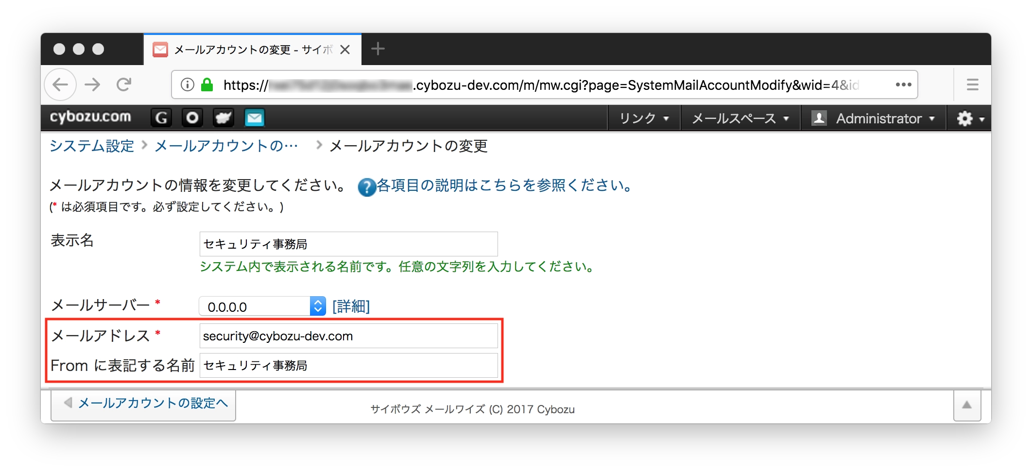 メールサーバーの登録後にメールアカウントを作成することで、メールワイズ上からメールを送信できるようになる。メールアカウントにはメール送信時のFromヘッダの値(メールアドレスと表記名)を設定できる。メールアドレスには検証環境のドメインを含めた security@cybozu-dev.com を、表記名には セキュリティ事務局 を入力してメールアカウントを作成する。