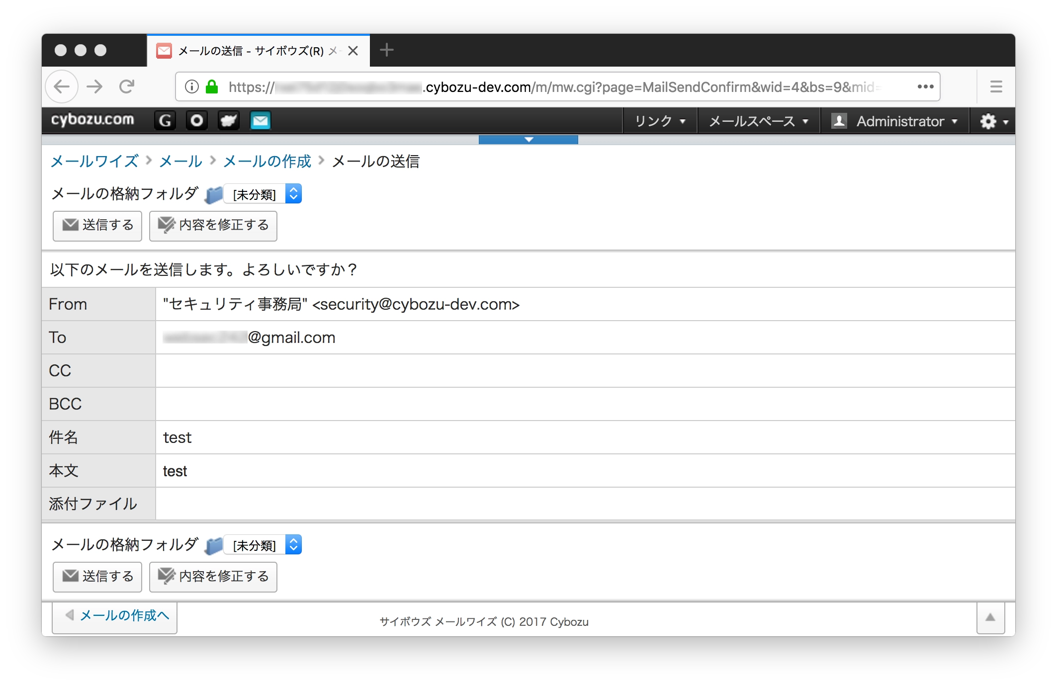 これにより "セキュリティ事務局" <security@cybozu-dev.com> から任意の宛先にメールを送信できるようになる。試しに私が所有するGmail宛にメールを送信する。