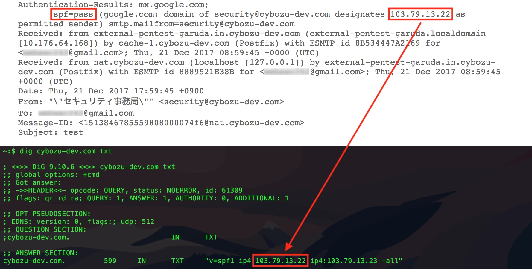 Gmailには セキュリティ事務局 から差し出されたメールが届く。メールの送信元IPアドレスは 103.79.13.22 であり、このIPアドレスは cybozu-dev.com のSPFレコードに含まれているため送信ドメイン認証に成功する。受信したメーラーで不正なメールと判定されない本物のメールを偽装できる状態だった。