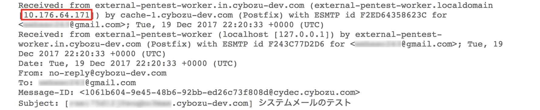 内部ネットワークに存在する他のホストに接続するには内部IPアドレスを特定する必要がある。内部IPアドレスの範囲を総当りすることで特定も可能だが、検証環境への高負荷が懸念される。総当たりは実施せず、サーバーの設定不備により漏洩した内部IPアドレスを探すと、検証環境から送信されるシステムメールのヘッダ情報にそれらしき値が見つかる。