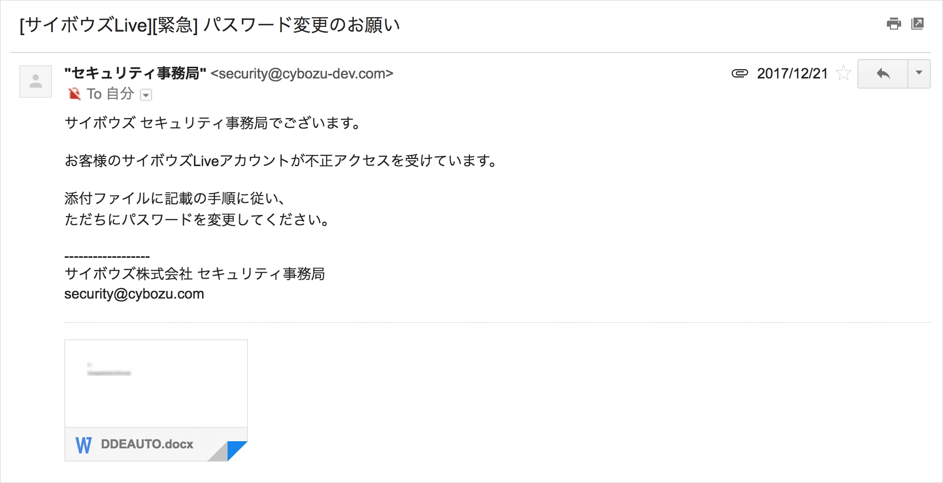 サイボウズの管理者やセキュリティ部門が使いそうなメールアドレスから送られたメールであれば、サイボウズ製品の利用者は何の疑いもなく開くだろう。メールワイズではファイルを添付したメールも送信できるため、以下のようなメールを利用者に送りつけることで高い添付ファイル開封率が期待できる。