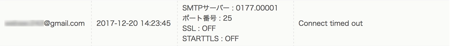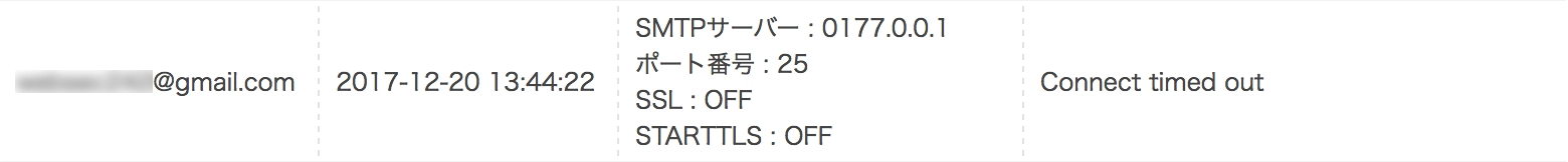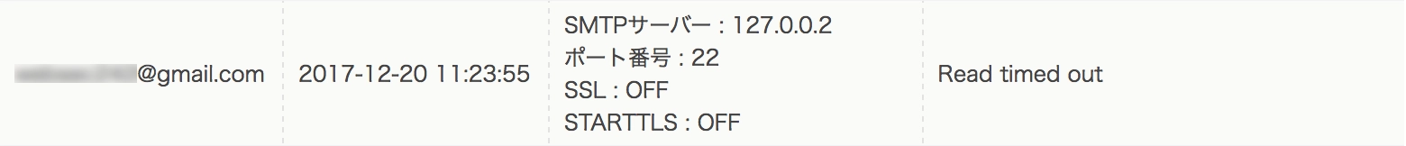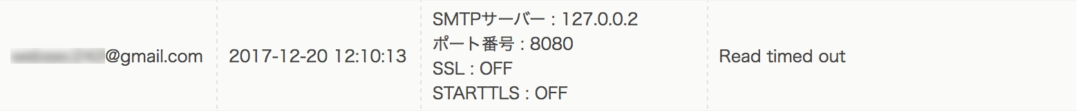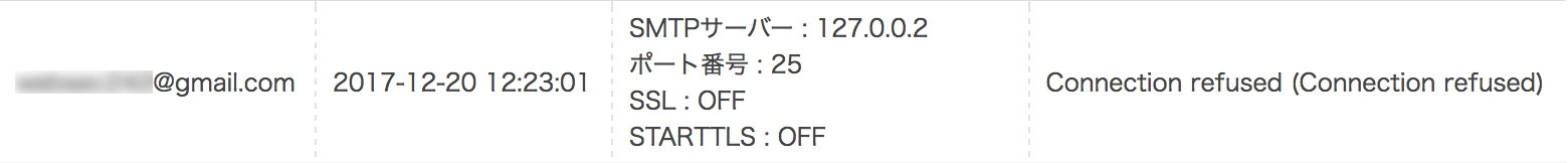 特殊用途のIPアドレスをまとめたRFC6890ではループバックアドレスを 127.0.0.0/8 と定義している。そのため 127.0.0.1 だけでなく 127.0.0.2 から 127.255.255.254 までのIPアドレスはループバックとして動作する。サーバー名に 127.0.0.2 を入力するとエラーは発生せず、SMTPサーバーの設定を保存できる。しかしテストメールの送信には失敗し、以下のエラーが履歴に残る。