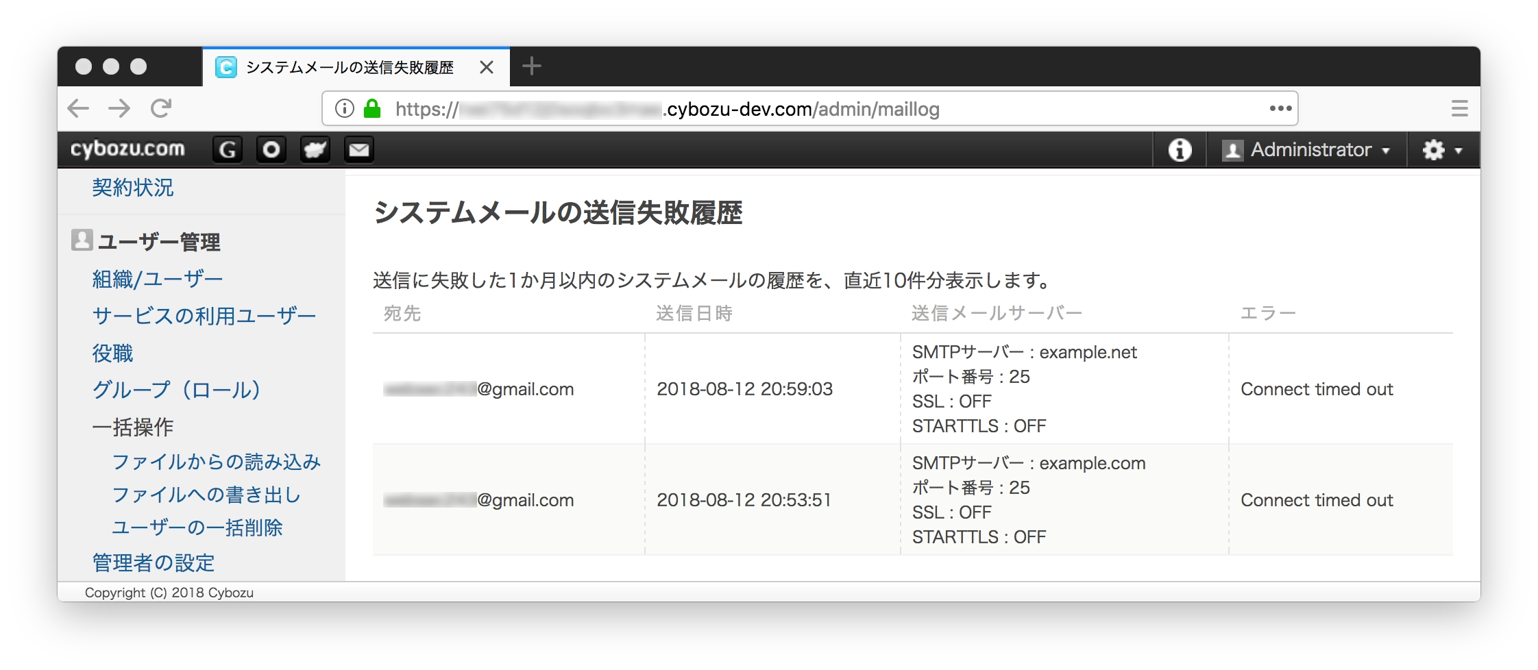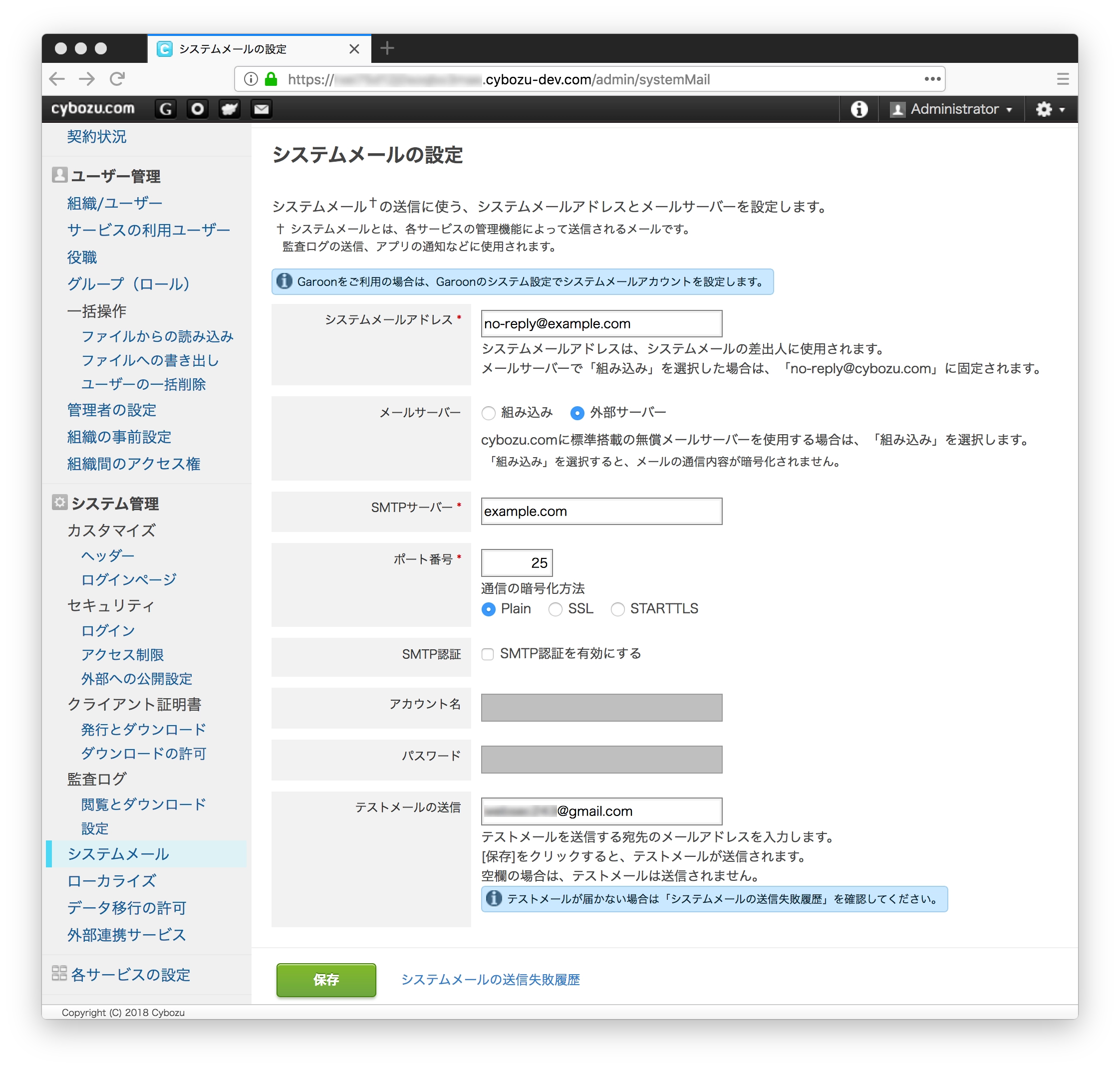cybozu.com共通管理では、各サービスから送信されるシステムメールも管理できる。標準設定のシステムメールは no-reply@cybozu.com から送信される。自社のメールアドレスからシステムメールを送信したい場合は、以下のページからSMTPサーバーを設定する。