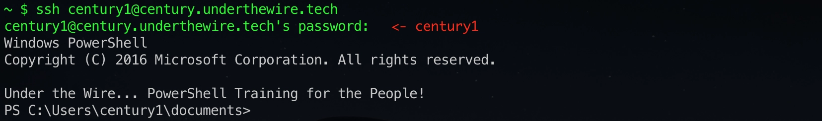 勉強会の後半は「Under The Wire」というPowerShellのオンライントレーニングに取り組んだ。トレーニング環境のサーバーにSSHでログインし、前半に学んだPowerShellの知識を活かして問題を解いていく。オンライントレーニングは5つのステージに分かれており、初級ステージであるCenturyのレベル1の問題から進める。