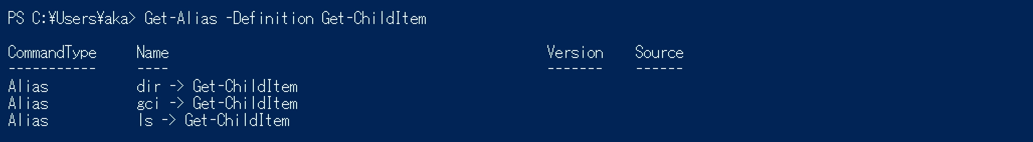 PowerShellのコマンドは 動詞-名詞 の形式で名付けられたコマンドレットの他に、エイリアスや関数、Windowsに付属するネイティブコマンド( ping.exe のようなEXE形式のコマンド)も含まれる。多くのコマンドレットにはUnix形式、Windows形式、PowerShell形式の3つのエイリアスが設定されている。例えば、指定のディレクトリにあるファイルの一覧を表示する Get-ChildItem の場合、ls、dir、gci がエイリアスとして機能する。エイリアスの設定は Get-Alias で確認できる。