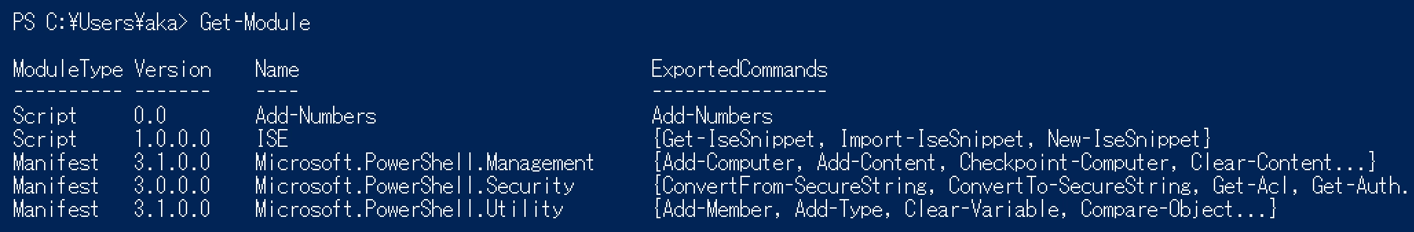 コマンドやスクリプトはPowerShellモジュールというファイルで定義されている。PowerShellモジュールは $env:PSModulePath に設定されたディレクトリから読み込まれる。読み込まれたモジュールは Get-Module で確認できる。