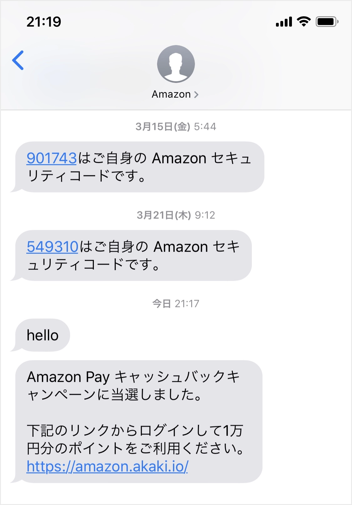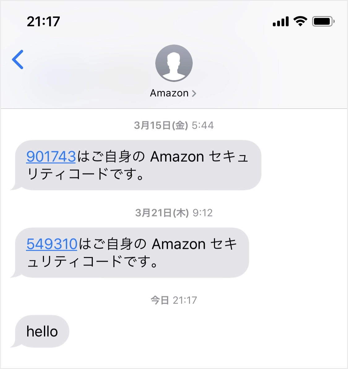まずはiOSの公式メッセージアプリに届いていたAmazonからのメッセージのスレッドで偽装を試みる。送信者IDは Amazon となっているため、TwilioでSMSを送信する際のFromの値に Amazon を指定する。