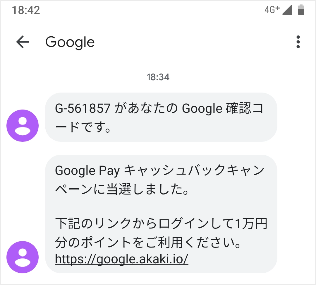 URLリンクを含んだ日本語のメッセージも送信できた。Androidの公式メッセージアプリでも同様に送信元の偽装を試みる。Googleからのメッセージの送信者IDである Google をFromの値に指定すると、送信したメッセージが正規のスレッドに含まれた。