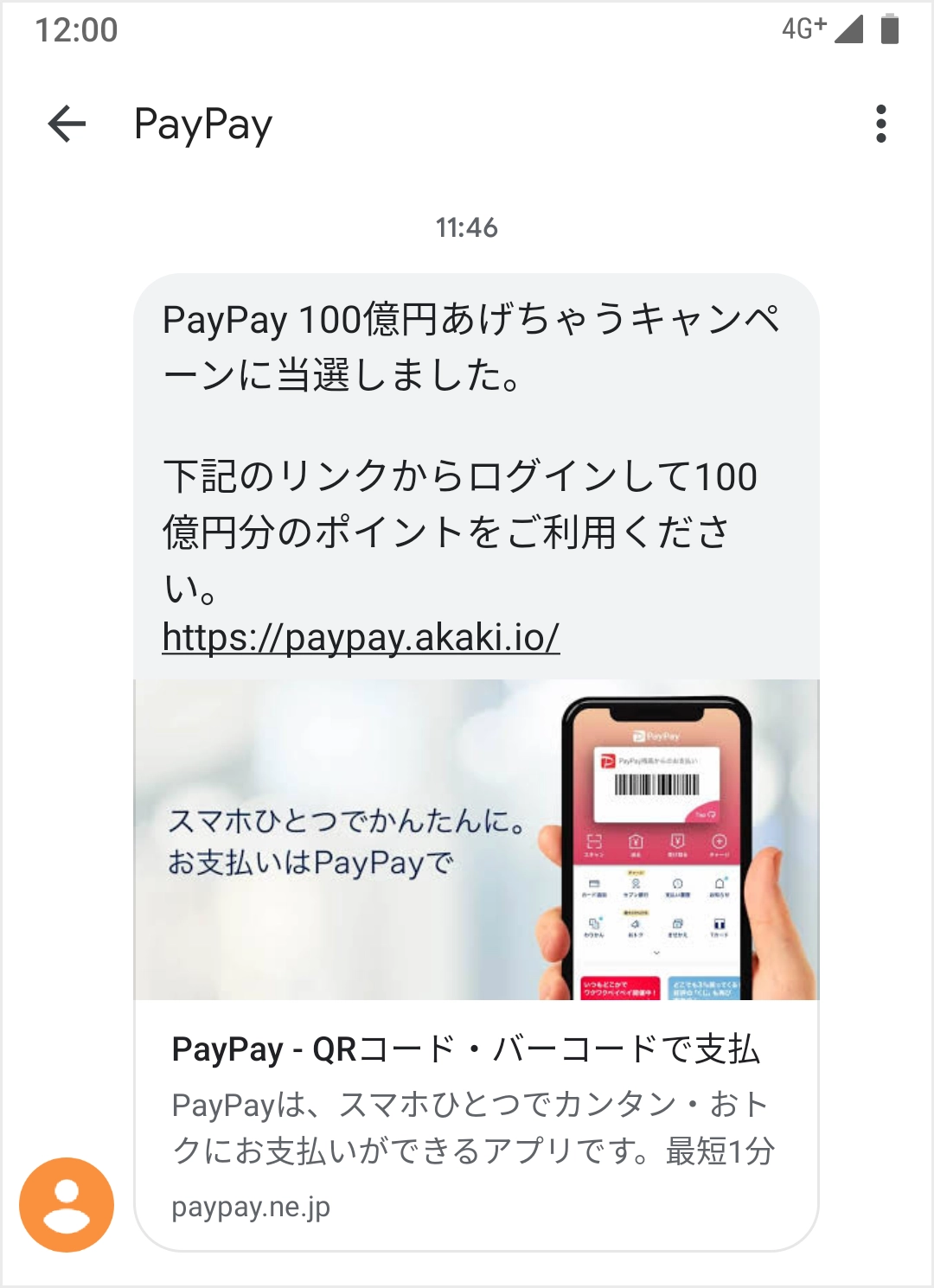 Twilioを利用した検証では、送信元の電話番号を偽装して正規のスレッドにメッセージを含めることはできなかった。しかし正規のスレッドに含めることを目的としなければ、独自に送信者IDを指定するだけで偽装したメッセージを送れる。送信者IDを PayPay と指定すればPayPayからの公式メッセージを装える。