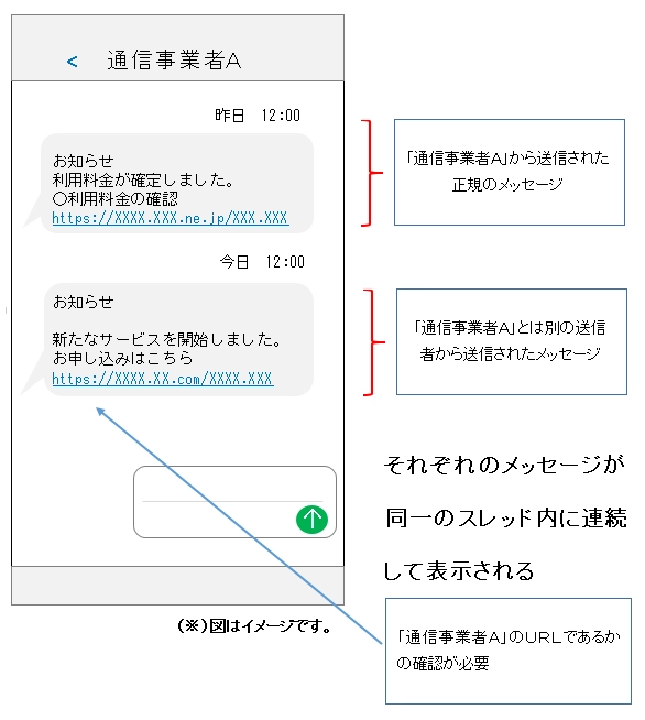 JC3の注意喚起では、以下の図を用いて「SMSの送信元を偽装したメッセージが正規の送信者のスレッドに届く」と説明している。