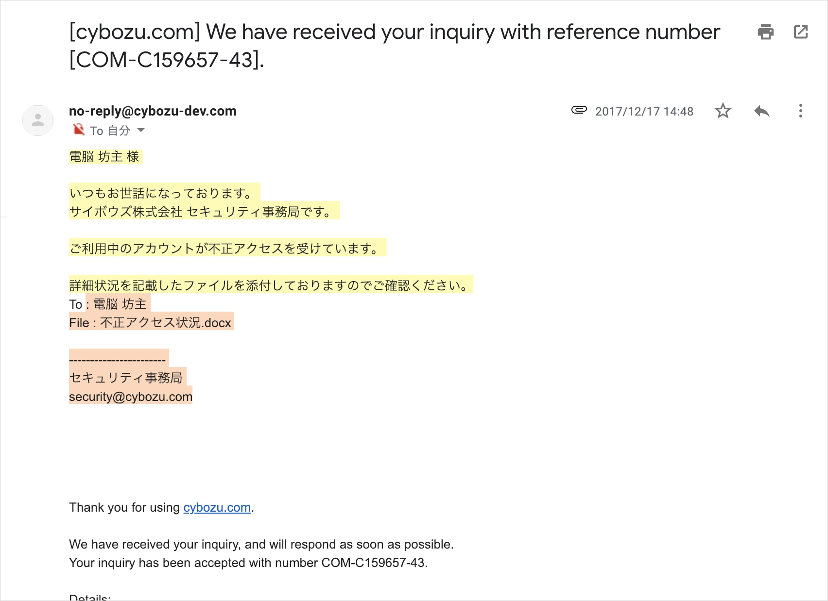 投稿時のリクエストに含まれるGETパラメータ _lc とAccept-Languageヘッダの値を操作することで、受付メールのタイトルと定型文を英語に変更できる。そのため標的となった日本人は英語のタイトルや定型文を読み飛ばし、不正に追記された日本語の文章に注目する可能性が高い。さらにお問い合わせフォームでは任意のファイルをアップロードでき、受付メールにはアップロードしたファイルが添付される。攻撃者は不正なファイルをアップロードし、被害者のメールアドレスを指定した不正なお問い合わせを投稿することで、上記のようなメールを被害者に送りつけられる状態だった。