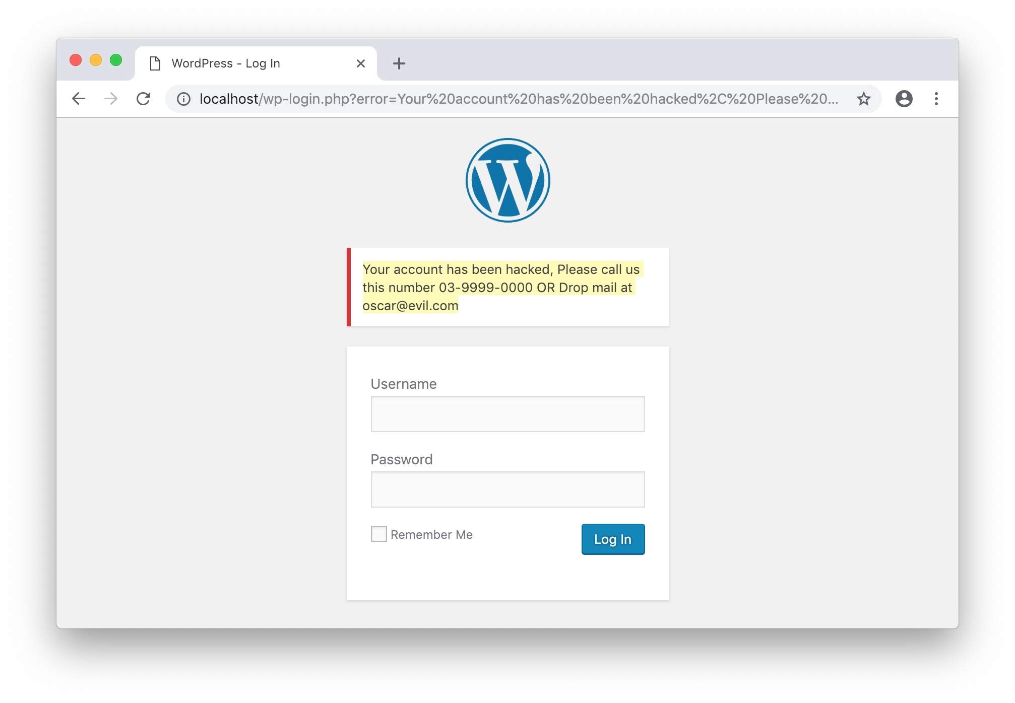 hxxps://example.com/wp-login.php?error=Your%20account%20has%20been%20hacked%2C%20Please%20call%20us%20this%20number%2003-9999-0000%20OR%20Drop%20mail%20at%20oscar%40evil.com