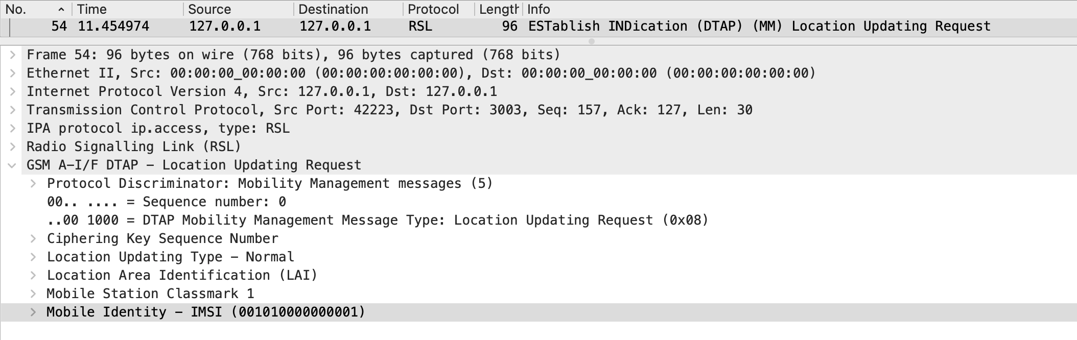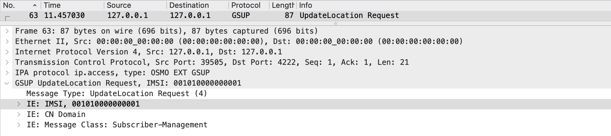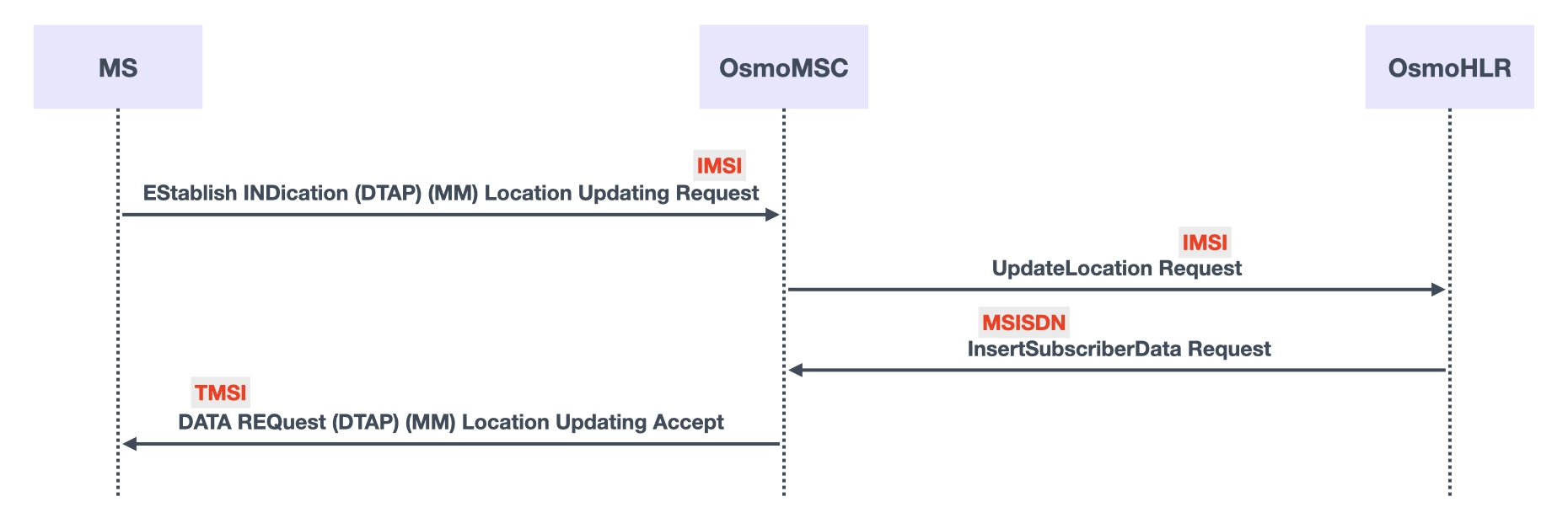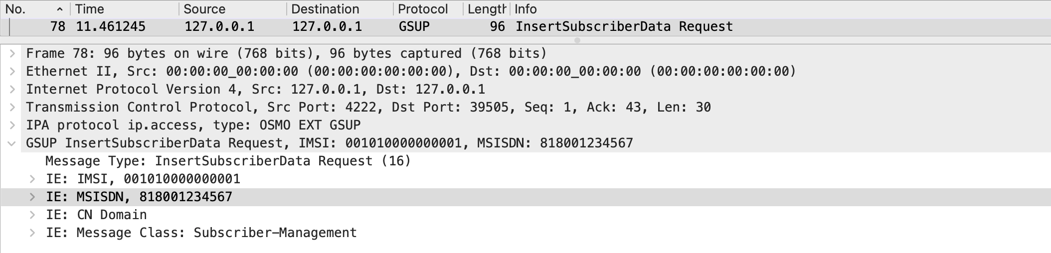 First, I analyzed the network traffic captured when the MS connected to the mobile network. When the MS connects, the MSC caches the subscriber information from the HLR to the VLR and assigns a TMSI (Temporary Mobile Subscriber Identity) to the MS. Figure 6 shows the DTAP (Direct Transfer Application Part) and GSUP (Generic Subscriber Update Protocol) packets captured when OsmocomBB launched. DTAP is a protocol designed for the A-interface between the BSC and MSC. It supports transparent message transfers between an MS and MSC. Moreover, the GSUP is an Osmocom-specific protocol used between OsmoMSC and OsmoHLR and is an alternative to the MAP (Mobile Application Part) protocol⁸. Because the two MSs run in OsmocomBB, the request and response for both protocols are captured in duplicate. Figure 7 presents a sequence diagram of the traffic in important packets. Observing the traffic flow, the MS first sends its IMSI to the OsmoMSC via a Location Updating Request (Figure 8). Next, the OsmoMSC sends the IMSI received to the OsmoHLR via an UpdateLocation Request (Figure 9), and the OsmoHLR sends the subscriber information associated with the received IMSI to the OsmoMSC via an InsertSubscriberData Request (Figure 10). In the case of Figure 10, MS1’s subscriber information includes the MSISDN 818001234567. Subsequently, the OsmoMSC issues a TMSI associated with the IMSI and sends it to the MS via a Location Updating Accept (Figure 11). This flow enables the VLR of OsmoMSC to cache the IMSI, MSISDN, and TMSI associated with the MS when the MS connects to the network. The information cached in the VLR can be checked using the show subscriber cache command, as shown in Figure 5.