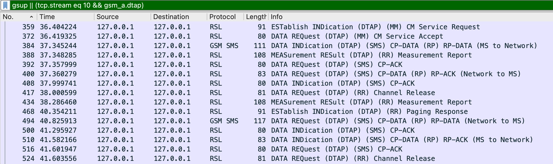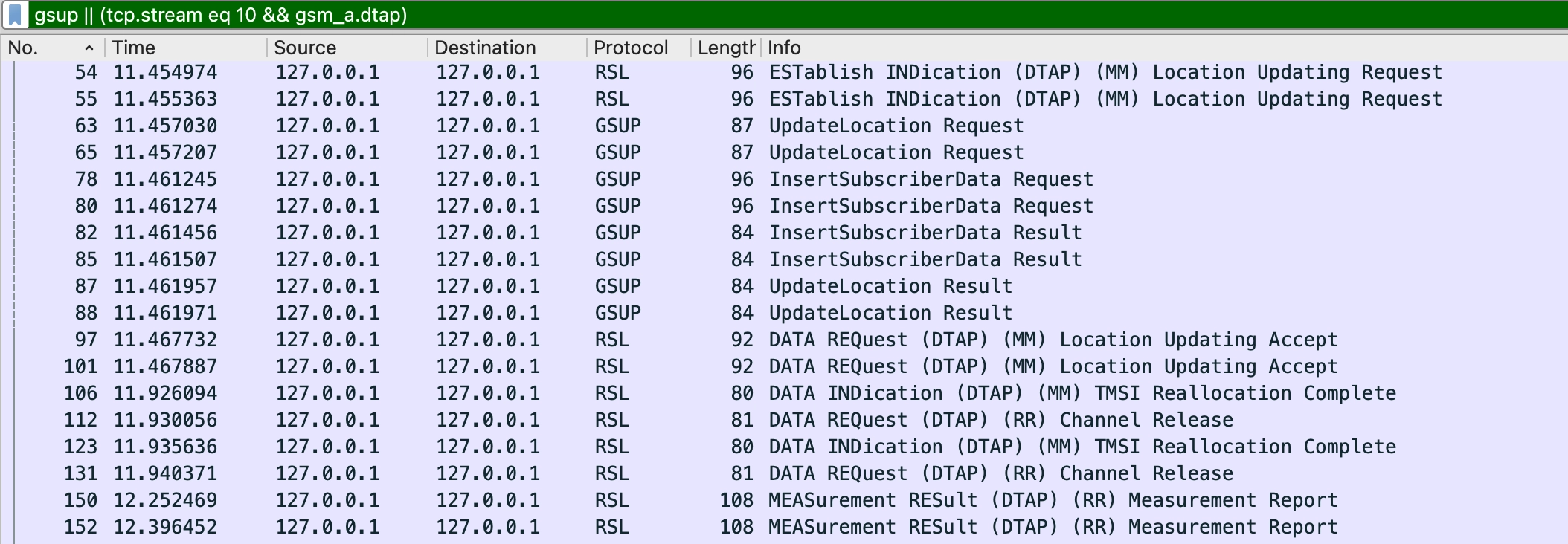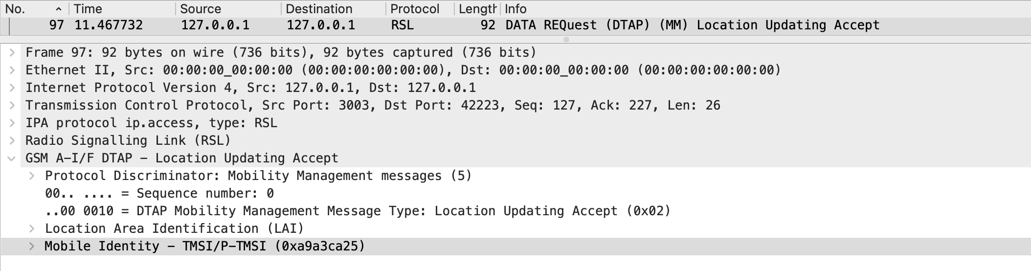 First, I analyzed the network traffic captured when the MS connected to the mobile network. When the MS connects, the MSC caches the subscriber information from the HLR to the VLR and assigns a TMSI (Temporary Mobile Subscriber Identity) to the MS. Figure 6 shows the DTAP (Direct Transfer Application Part) and GSUP (Generic Subscriber Update Protocol) packets captured when OsmocomBB launched. DTAP is a protocol designed for the A-interface between the BSC and MSC. It supports transparent message transfers between an MS and MSC. Moreover, the GSUP is an Osmocom-specific protocol used between OsmoMSC and OsmoHLR and is an alternative to the MAP (Mobile Application Part) protocol⁸. Because the two MSs run in OsmocomBB, the request and response for both protocols are captured in duplicate. Figure 7 presents a sequence diagram of the traffic in important packets. Observing the traffic flow, the MS first sends its IMSI to the OsmoMSC via a Location Updating Request (Figure 8). Next, the OsmoMSC sends the IMSI received to the OsmoHLR via an UpdateLocation Request (Figure 9), and the OsmoHLR sends the subscriber information associated with the received IMSI to the OsmoMSC via an InsertSubscriberData Request (Figure 10). In the case of Figure 10, MS1’s subscriber information includes the MSISDN 818001234567. Subsequently, the OsmoMSC issues a TMSI associated with the IMSI and sends it to the MS via a Location Updating Accept (Figure 11). This flow enables the VLR of OsmoMSC to cache the IMSI, MSISDN, and TMSI associated with the MS when the MS connects to the network. The information cached in the VLR can be checked using the show subscriber cache command, as shown in Figure 5.
