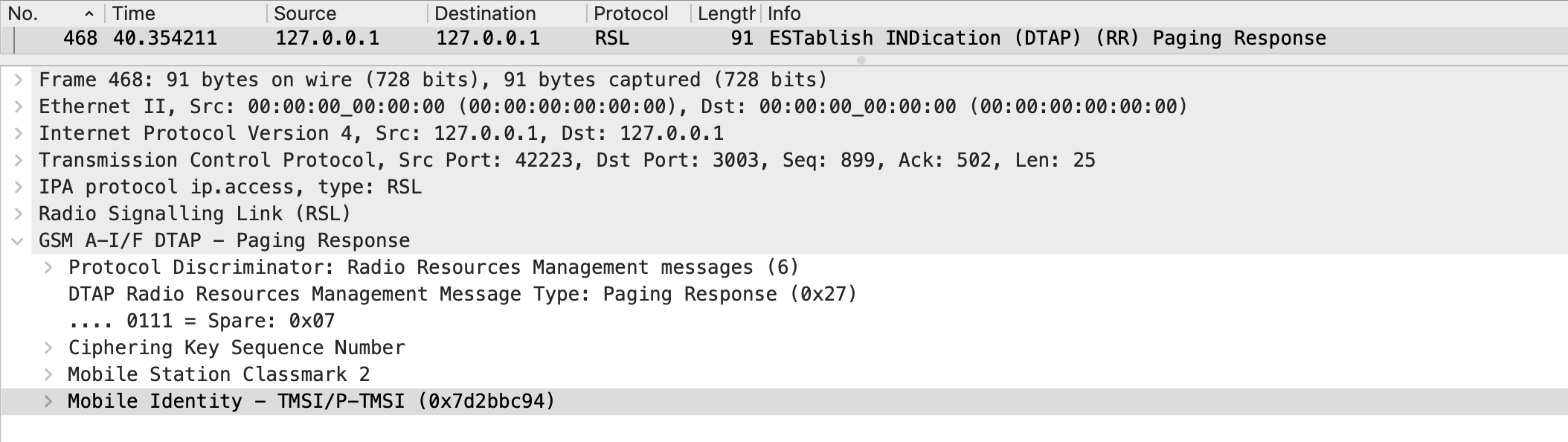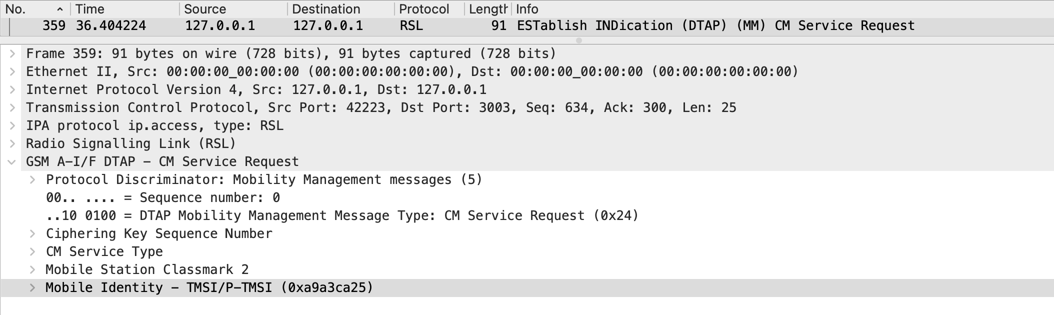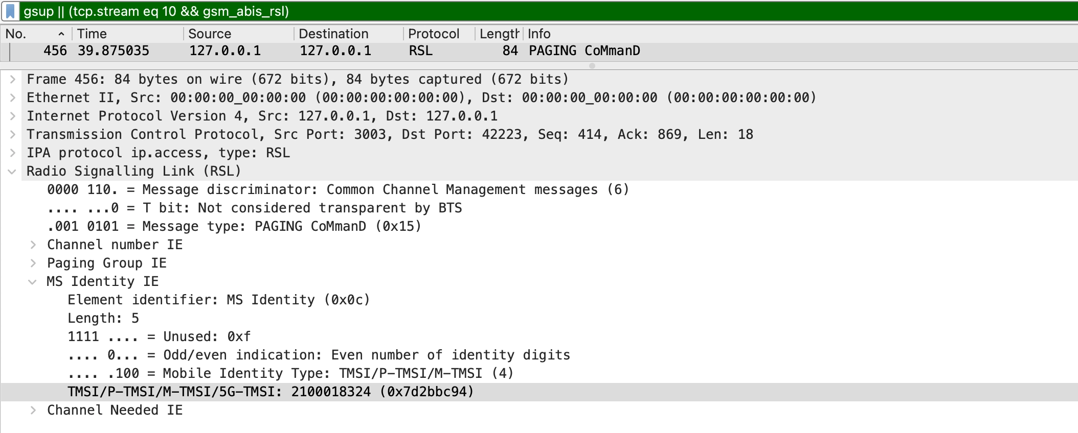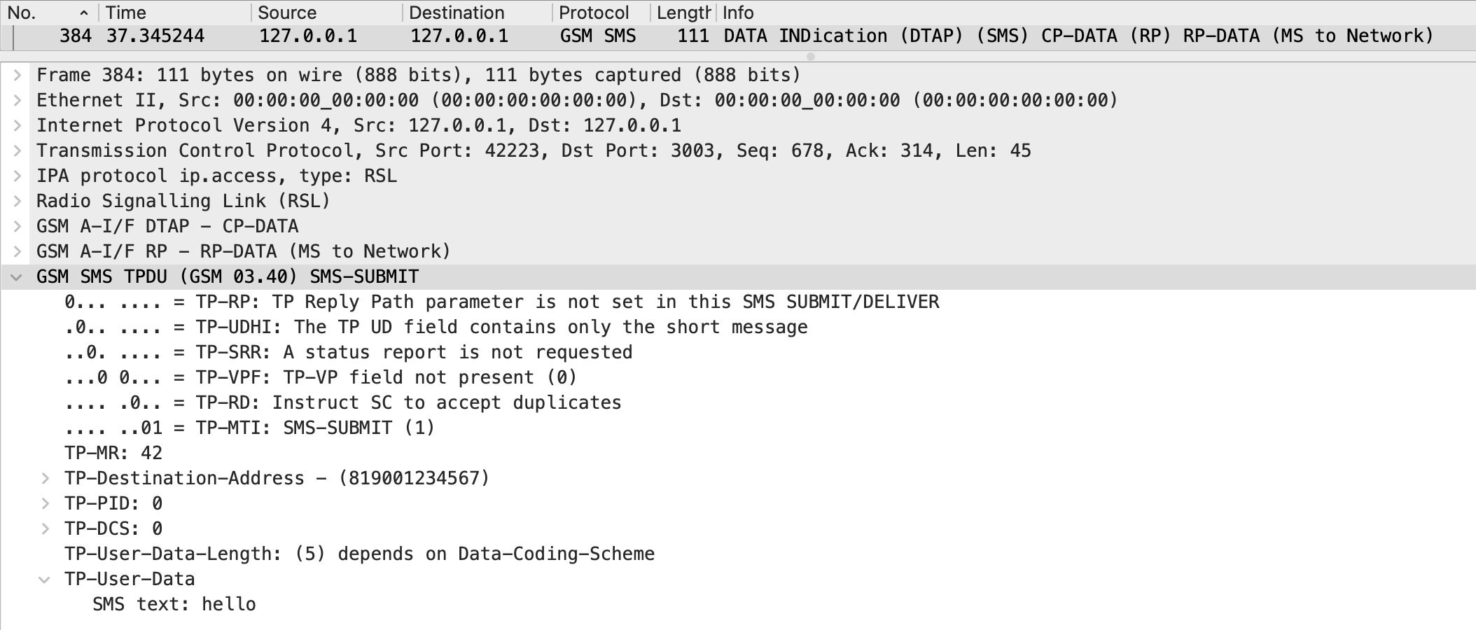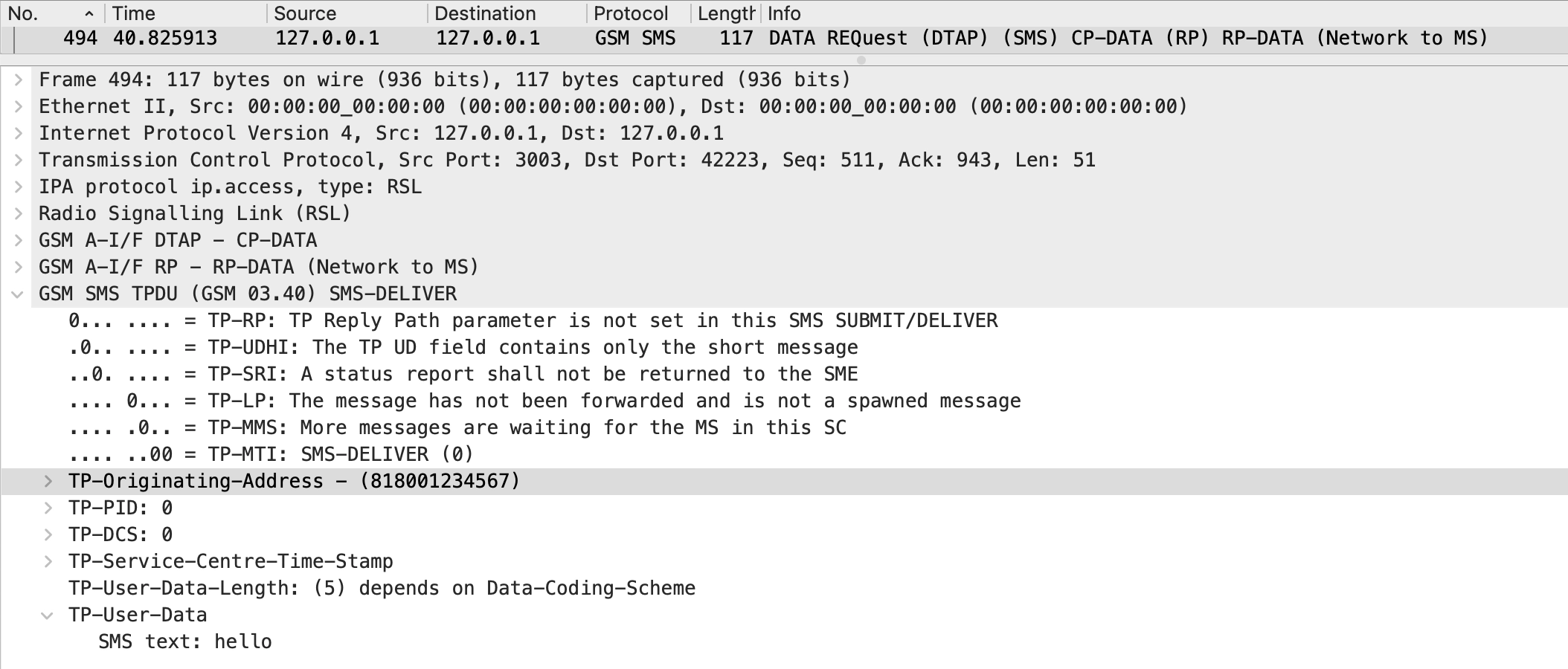Next, I analyzed the network traffic captured when a short message was sent or received. Before submitting the short message, sender MS1 submitted its TMSI to the MSC. Figure 12 shows the DTAP packets captured when a short message is sent and received, and Figure 13 provides a sequence diagram of the traffic in important packets. Observing the traffic flow, MS1 first sends its TMSI to the OsmoMSC via a CM Service Request (Figure 14), and then sends an SMS-SUBMIT to the OsmoMSC (Figure 15). Subsequently, receiver MS2 sends its TMSI to the OsmoMSC via a Paging Response (Figure 16). Although not shown in Figure 12, immediately prior to this, the OsmoMSC sends a PAGING CoMmanD loaded with MS2’s TMSI over the RSL (Radio Signalling Link) protocol (Figure 17). After the paging response, MS2 receives an SMS-DELIVER from the OsmoMSC (Figure 18). As shown in Figure 18, MS1’s phone number 818001234567 was loaded into the TP-OA field of the SMS-DELIVER. The first half of the flow enables the MSC to obtain the MSISDN associated with the sender’s TMSI from the VLR upon receiving the SMS-SUBMIT.