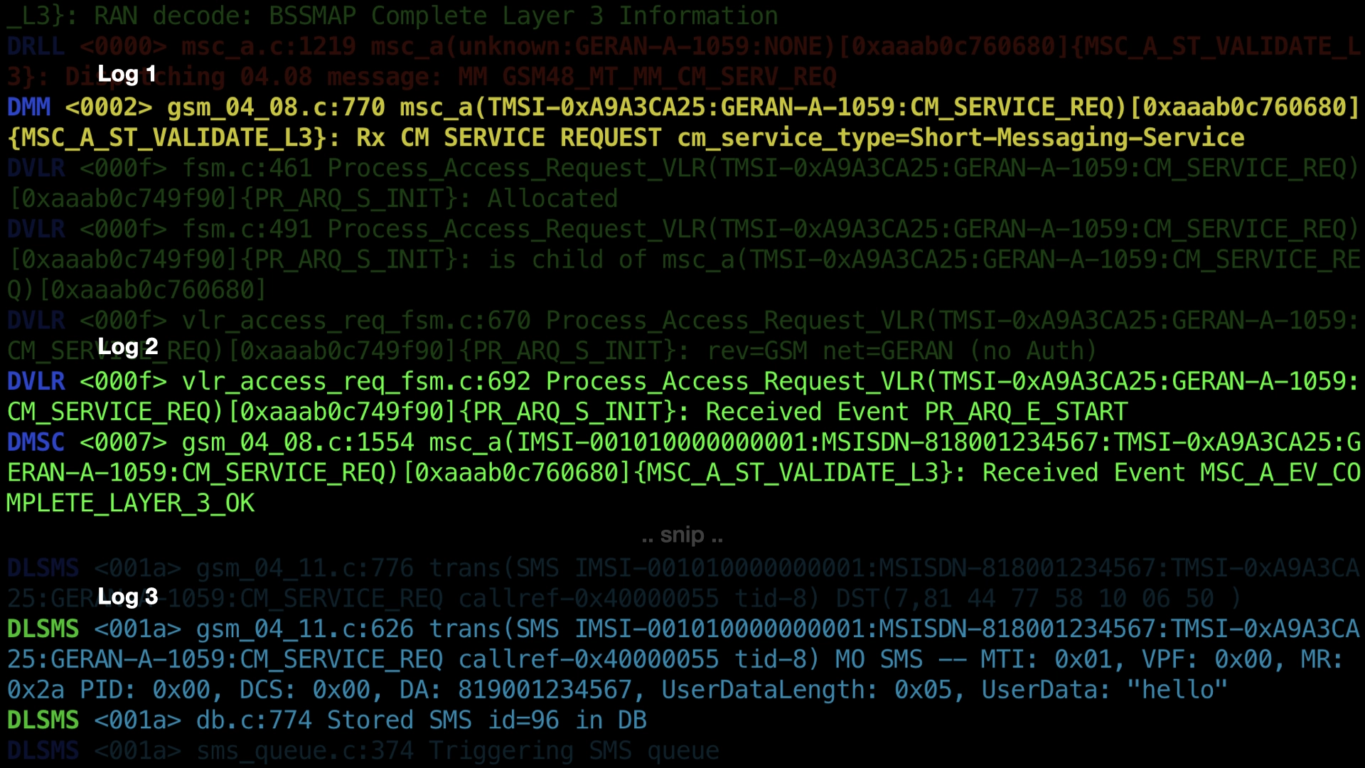 Subsequently, I analyzed the log output when the OsmoMSC received the SMS-SUBMIT. Upon receiving the SMS-SUBMIT, the MSC obtains the sender’s MSISDN from the VLR and can forward it to the SMSC. The VLR and SMSC are built into OsmoMSC; thus, no traffic exists between them and the MSC. Therefore, I inferred the behavior of the OsmoMSC after receiving the SMS-SUBMIT based on its output logs. Figure 19 shows a part of the debug log output when the OsmoMSC received the SMS-SUBMIT. Log 1 shows that MS1’s TMSI was received by the CM Service Request. Log 2 indicates that the MSISDN 818001234567 associated with MS1’s TMSI was obtained from the VLR, and log 3 shows that the short message transferred by SMS-SUBMIT and MS1’s MSISDN are stored in the database. Based on these behaviors, I infer that the SMSC database stores a short message according to its originating phone number.