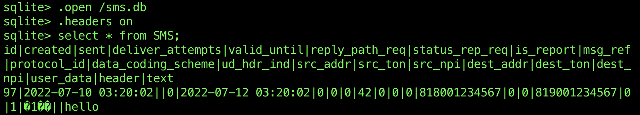 Finally, I confirmed that the actual data is stored in the database when the SMSC receives the SMS-SUBMIT. Within the SMSC database, a short message is stored according to its originating phone number. OsmoMSC was designed to temporarily store short messages received in an SQLite database called sms.db. Figure 20 shows the data temporarily stored in the database when a short message is resent from MS1 to MS2. The short messages sent from MS1 and MS1’s MSISDN 818001234567 can be seen to be stored in the same record. Therefore, the SMSC can load the originating phone number into the TP-OA field by building the SMS-DELIVER based on this record.