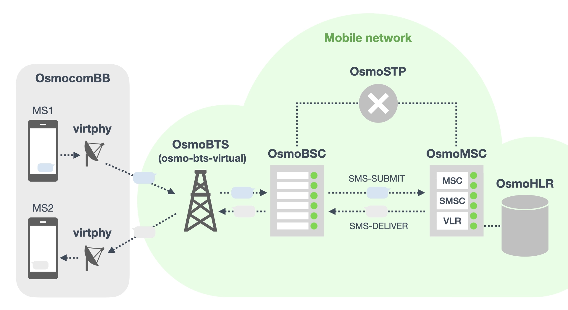 To reproduce an SMS transfer via the MSC, I built a virtual mobile network using software provided by Osmocom. Osmocom is an open-source mobile communications enabling project that provides a variety of software for building 2G and 3G mobile networks³. I conducted the test in a 2G circuit-switched network built by combining their software⁴. Figure 3 illustrates the network structure. OsmoMSC, which is Osmocom’s implementation of an MSC, has a built-in SMSC and VLR, whereas SMS-IWMSC does not. OsmoHLR is responsible for the HLR (Home Location Register), which stores the source of subscriber information that is cached by the VLR. Between OsmoMSC and the MS, OsmoSTP acts as a signal transfer point, OsmoBTS as a base transceiver station, and OsmoBSC as the controller of OsmoBTS. In addition, the use of OsmocomBB and virtphy as the MS enables software-only testing⁵.