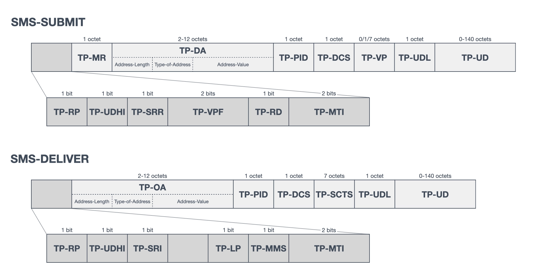 The structure of the PDU (Protocol Data Unit) for short message transfer is also defined in 3GPP TS 23.040. This specification defines the PDUs for the six message types in the transfer layer. This article describes the PDU structures of SMS-SUBMIT and SMS-DELIVER (shown in Figure 2), which are related to silent SMS. TP-MTI (TP-Message-Type-Indicator) indicates the message type of the PDU, while TP-PID (TP-Protocol-Identifier) indicates the protocol to the upper layer. In the case of a normal text message, TP-DA (TP-Destination-Address) contains the destination phone number, TP-OA (TP-Originating-Address) contains the originating phone number, and TP-UD (TP-User-Data) contains the message text. Other elements are described in Sections 9.2.2.1 and 9.2.2.2 of the specification.