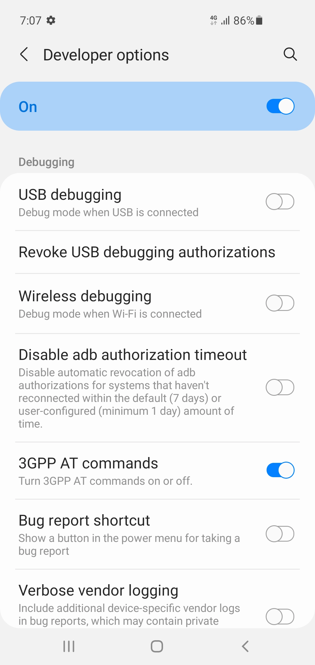 SMS PDUs can be sent using AT commands by utilizing an Android device as a USB modem. Whether the Android device exposes the USB modem interface depends on the model. Tian et al. (2018) showed that non-rooted Android devices manufactured by Samsung and LG exposed a USB modem interface⁵. This study provides an example of connecting a non-rooted Samsung Galaxy S10 (Android 11) to a MacBook via USB in MTP mode and then executing AT commands on the exposed USB modem interface /dev/tty.usbmodemRF8M6███████. AT commands are used to control modems, and extended commands for controlling SMS have been standardized in 3GPP TS 27.005⁶. To use AT commands on the Galaxy S10, enabling Developer options > 3GPP AT commands is necessary, as shown in Figure 3.