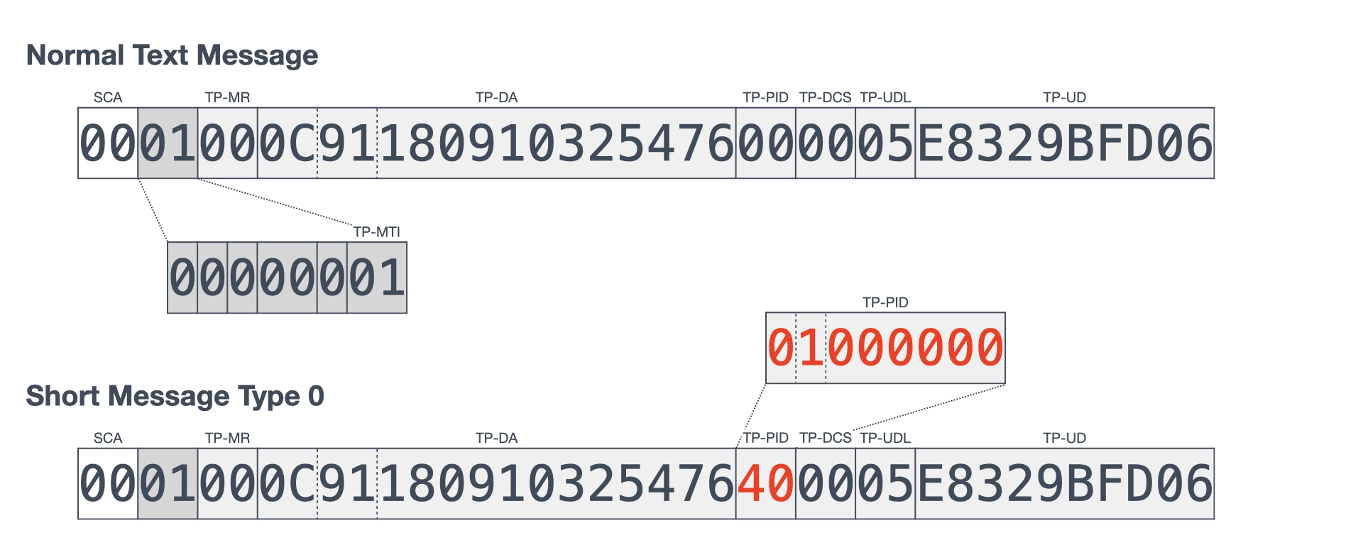 To compare the reception of a normal text message with that of a silent SMS, I sent two types of SMS PDUs, as shown in Figure 4. In this figure, the PDU of a normal text message is shown at the top and that of short message type 0 is shown at the bottom. At the beginning of both PDUs, 00 is added as the SCA (Service Center Address) to indicate the default SMSC, and 01 is set in the TP-MTI to indicate SMS-SUBMIT. The TP-PID is set to 00 for a normal text message, and 40 (bit pattern: 01000000) for short message type 0. The phone number +819001234567 set as the TP-DA in the figure is a dummy. The TP-UD is set to hello encoded in GSM 7-bit characters, as defined by 3GPP TS 23.038 (originally GSM 03.38)⁷.