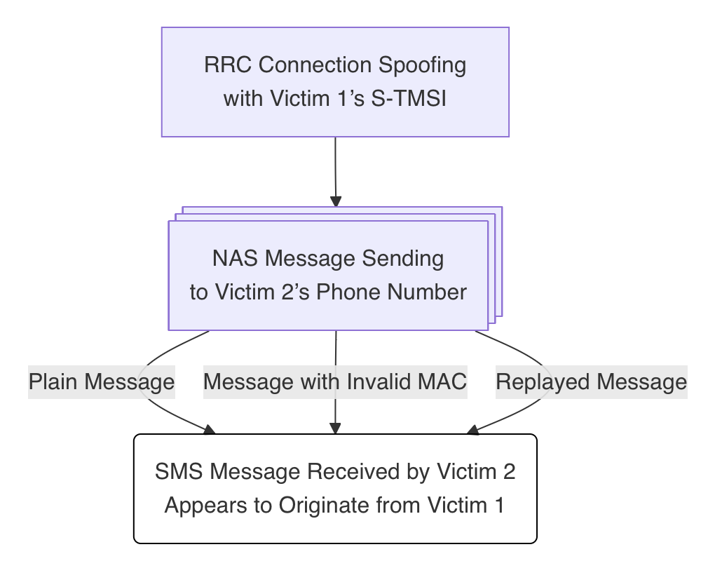 In the next phase, after successfully establishing an RRC connection using victim 1’s S-TMSI, the attacker sends a NAS message containing an SMS-SUBMIT directed to victim 2 through the LTE network. According to 3GPP TS 24.301³, which defines the LTE NAS specifications, integrity protection and encryption are defined for NAS security. Encryption is optional, while integrity protection becomes mandatory once the security context is established through the NAS registration procedure. Therefore, before initiating the NAS registration procedure, specifically immediately after successfully establishing an RRC connection using victim 1’s S-TMSI, the attacker may successfully deliver an SMS message that appears to originate from victim 1’s phone number by sending an Uplink NAS transport containing an SMS-SUBMIT to the AMF.