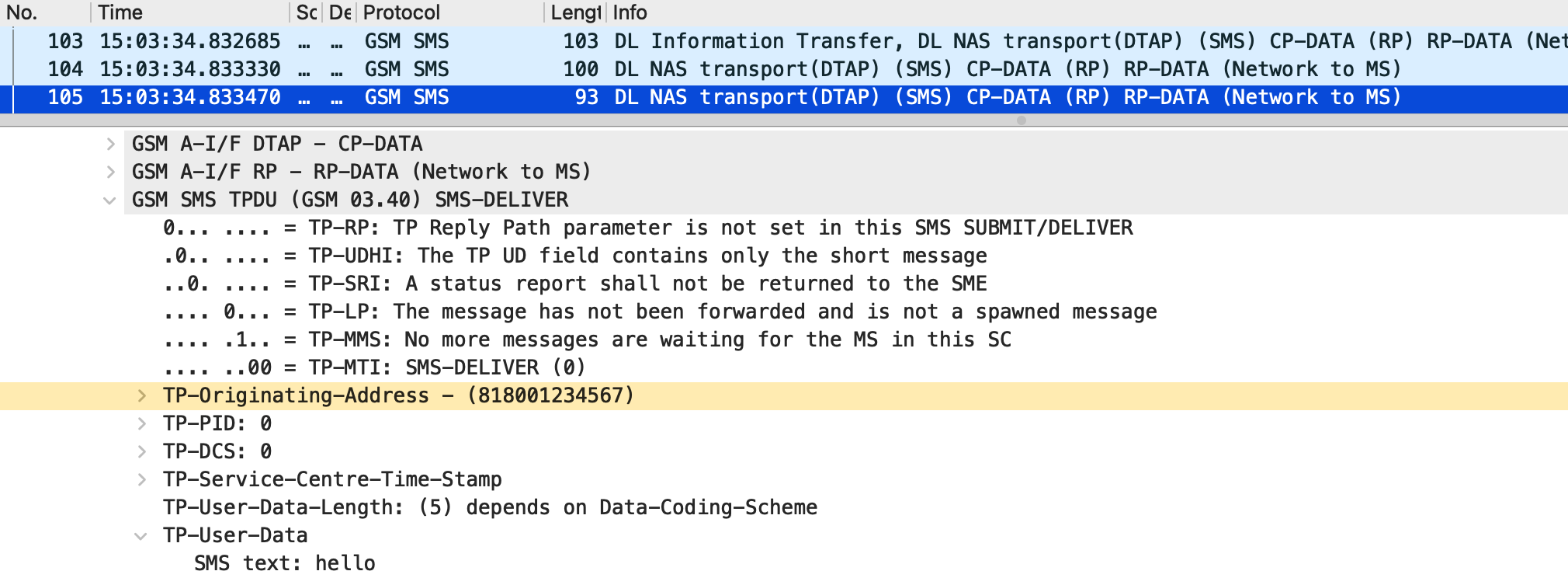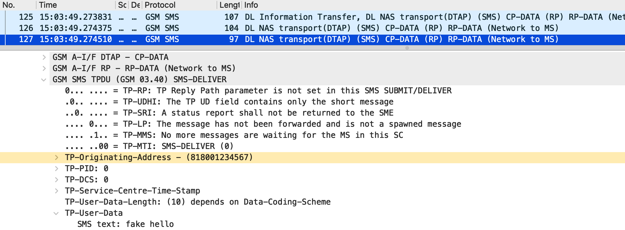The spoofability of SMS over NAS was demonstrated by comparing the origin of the delivered SMS PDUs. Figure 15 shows the packet of the legitimate SMS message received by UE2 from UE1, while Figure 16 shows the fake SMS message received from UE3. In both cases, the TP-Originating-Address field in the SMS-DELIVER is set to UE1’s phone number 818001234567. This result is consistent with my previous study, in which I demonstrated the spoofability of SMS using SMPP¹⁰. Therefore, it is concluded that the spoofability of SMS over NAS also exists in 5G mobile networks.