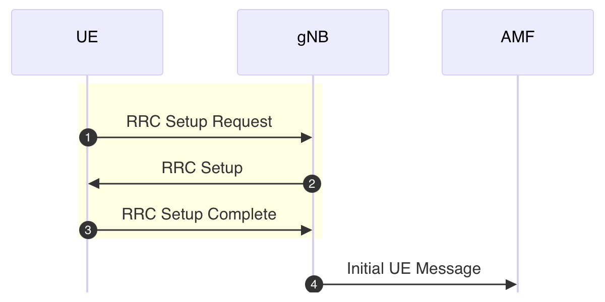 To reproduce RRC connection spoofing, the 5G-S-TMSI was specified during the RRC connection establishment procedure in 5G. Figure 3 shows the sequence of the RRC connection establishment procedure based on 3GPP TS 38.331⁷, which defines the RRC specifications for 5G NR, and 3GPP TS 38.413⁸, which defines the NGAP specifications. According to 3GPP TS 38.331, two elements are defined for the UE to present the 5G-S-TMSI to the gNB: the ue-Identity element in the RRC Setup Request and the ng-5G-S-TMSI-Value element in the RRC Setup Complete. When the gNB receives the 5G-S-TMSI from the UE, it includes the provided value in an Initial UE Message and forwards it to the AMF, following the specifications of 3GPP TS 38.413.