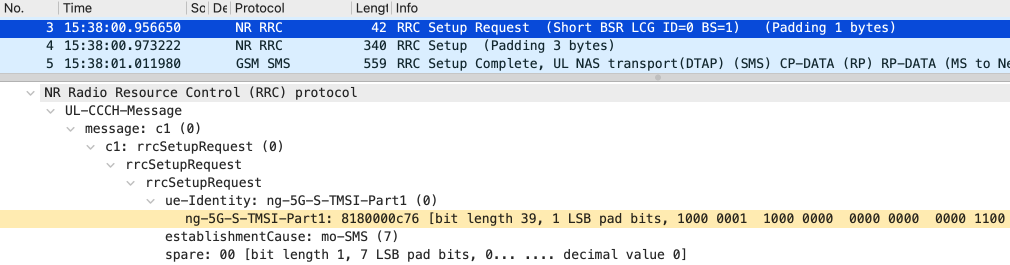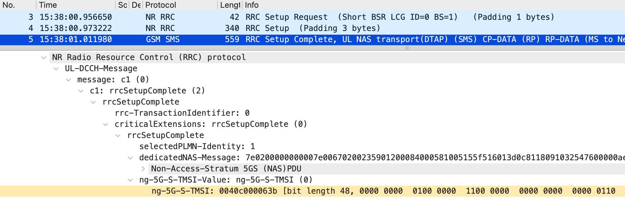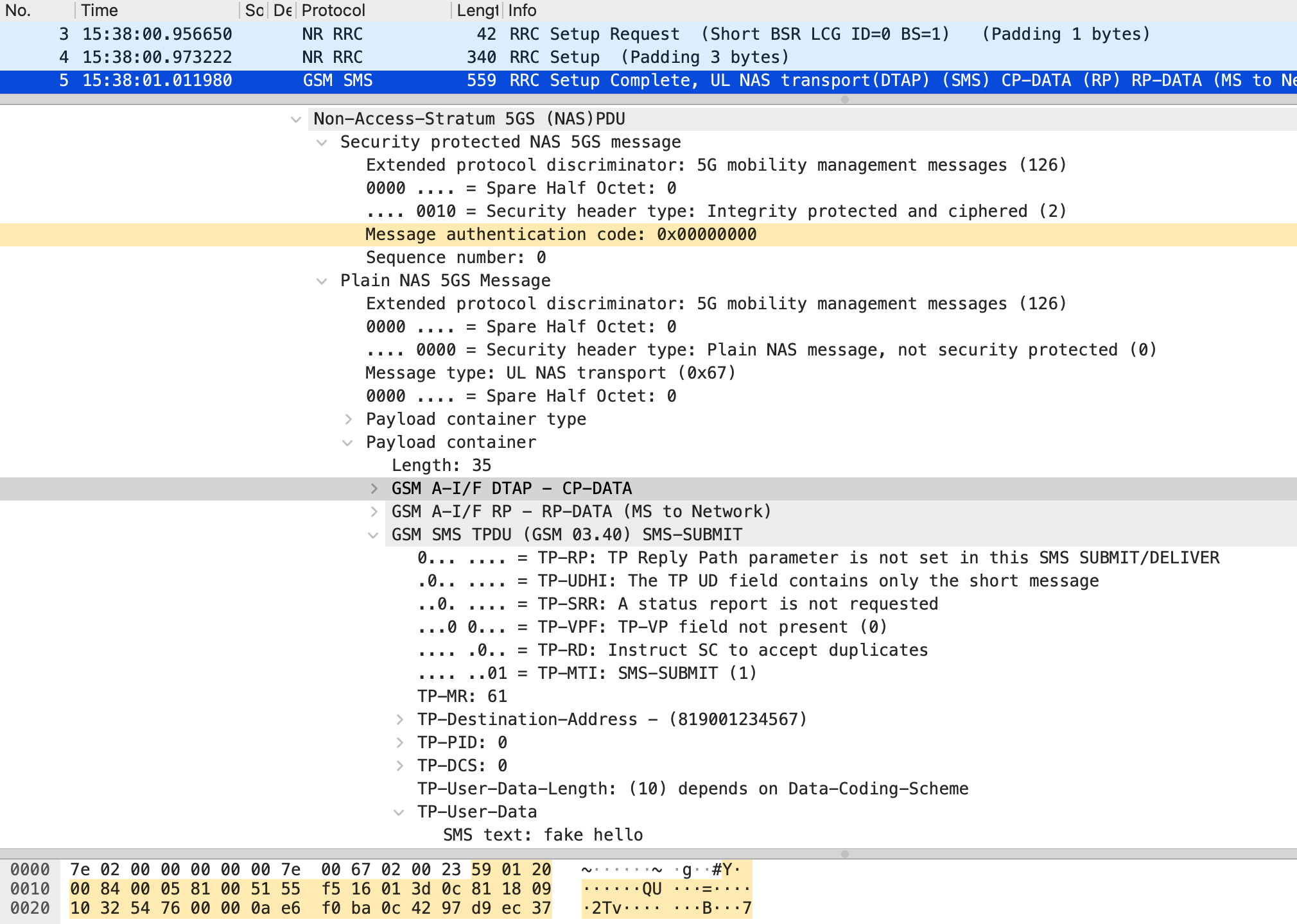 When the 5G-S-TMSI for RRC connection establishment is specified, smsUE protects the Uplink NAS transport with an invalid MAC. According to 3GPP TS 33.501⁹, which defines the security architecture of 5GS, the integrity of NAS messages is verified by checking whether the MAC calculated by the UE matches the one calculated by the AMF. However, when the rrc.nr_ue_id option is set, smsUE sends the Uplink NAS transport before initiating the NAS registration procedure, making it impossible to generate a valid MAC that matches the one calculated by the AMF. Therefore, as shown in Figure 9, smsUE sets the MAC to 0x00000000 when sending the Uplink NAS transport. Figure 9 also shows that the payload of the Uplink NAS transport contains the SMS Protocol Data Unit (PDU) shown in Figure 8.
