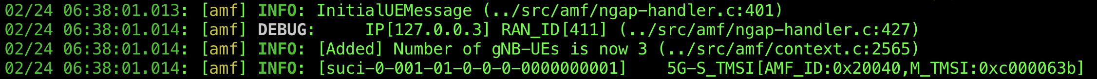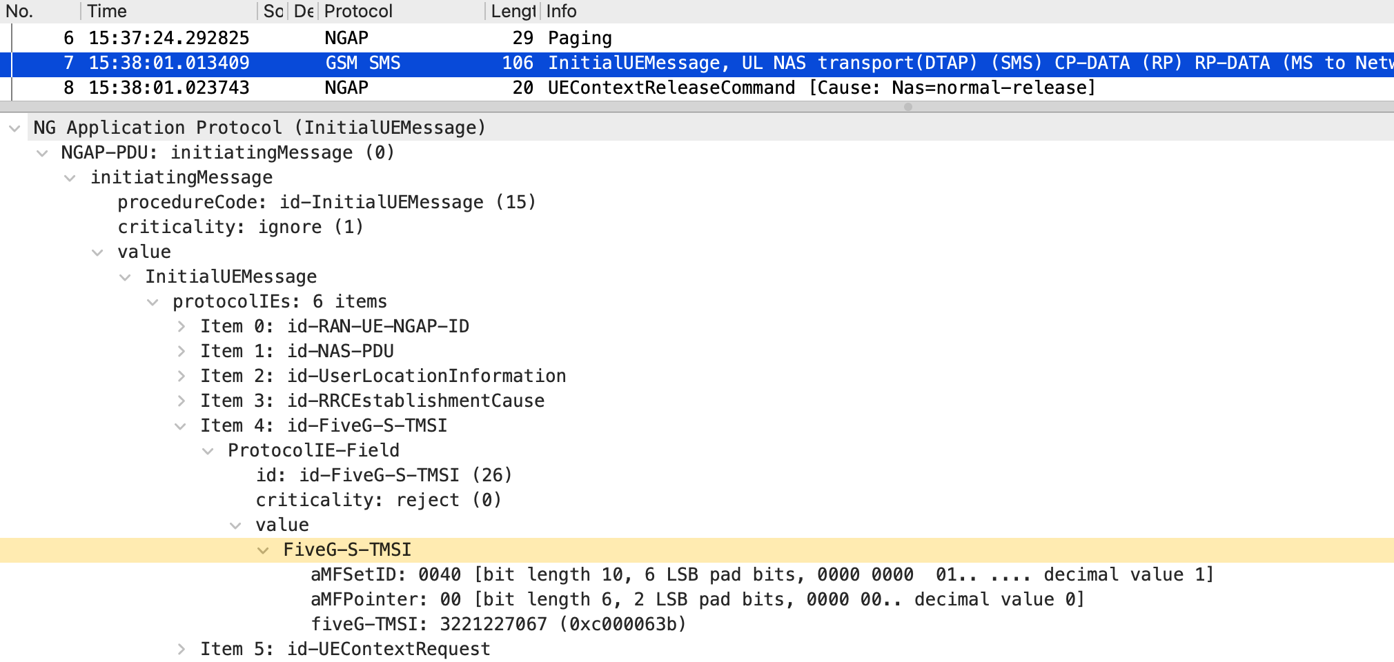 The spoofed sender, UE3, establishes an RRC connection by specifying the 5G-S-TMSI assigned to the legitimate sender, UE1. For example, if UE1’s 5G-S-TMSI is 0x40c000063b, smsUE, acting as UE3, can impersonate UE1 and establish an RRC connection by using the --rrc.nr_ue_id 40c000063b command-line option. The packets captured when UE3 spoofed the RRC connection are shown in Figures 4–6, and the Open5GS logs are shown in Figure 7. In Figure 4, part of UE1’s 5G-S-TMSI is set in the ue-Identity element of the RRC Setup Request. Specifically, ng-5G-S-TMSI-Part1 corresponds to the rightmost 39 bits of the 5G-S-TMSI. As a result, the configured value appears different in hexadecimal notation but matches in binary notation. Furthermore, Figure 5 shows that the ng-5G-S-TMSI-Value element in the RRC Setup Complete contains UE1’s 5G-S-TMSI, while Figure 6 shows that the FiveG-S-TMSI element in the Initial UE Message also contains UE1’s 5G-S-TMSI. As shown in the logs in Figure 7, the Initial UE Message was recognized by the AMF as a connection from UE1. Therefore, UE3 successfully established an RRC connection by impersonating UE1.