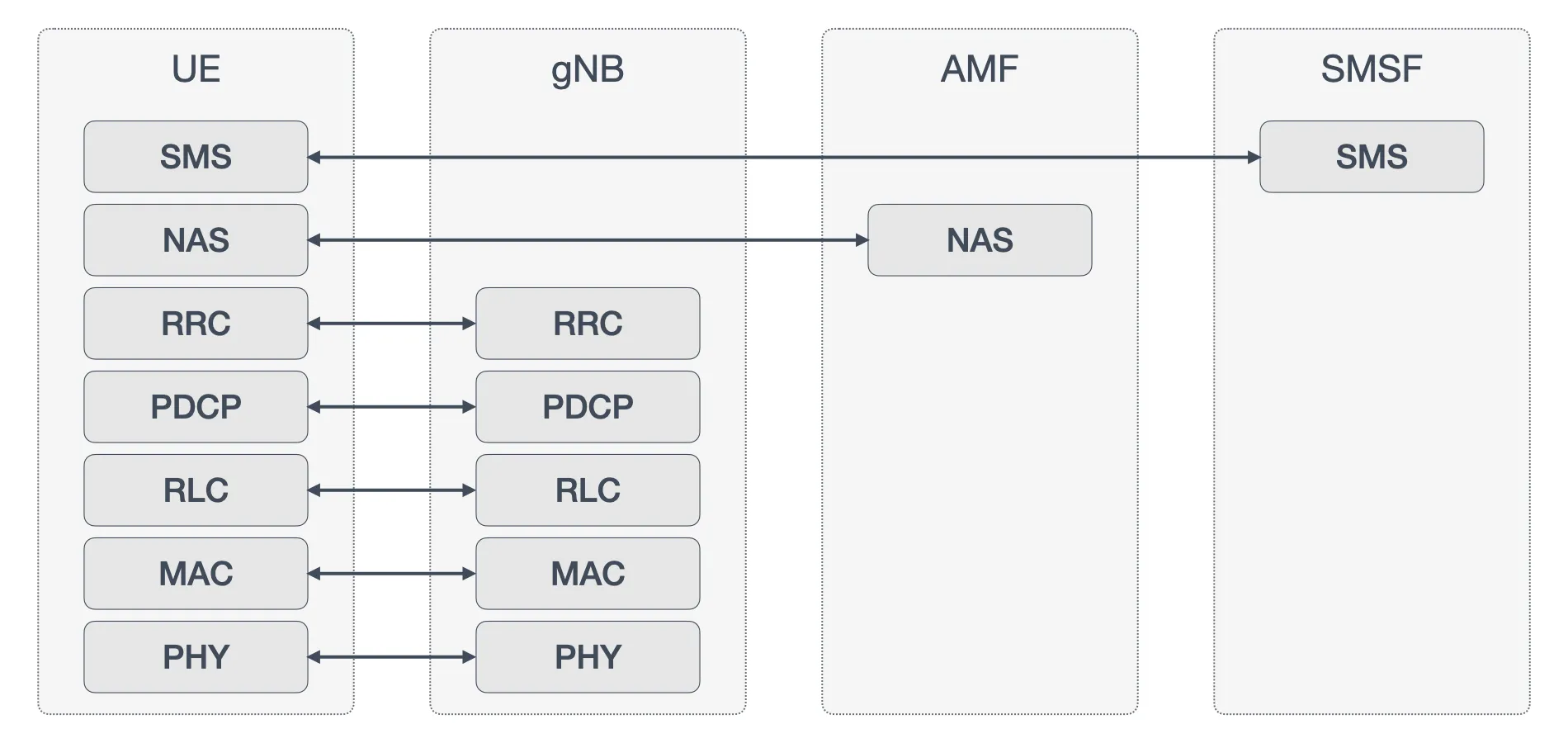 To investigate the actual behavior of SMS over NAS, it is necessary to manipulate data not visible to users in general message exchange. In SMS client apps, users can only input values such as a destination phone number and message text. This means that only certain parts of an SMS Protocol Data Unit (PDU) can be manipulated. Figure 1 illustrates the control plane protocol stack shown in 3GPP TS 38.300¹, which defines the 5G radio interface protocol architecture, with the addition of SMS. To investigate the behavior of the Access and Mobility Management Function (AMF) and the Short Message Service Function (SMSF), which control SMS over NAS in the CN, it is necessary to manipulate the SMS PDUs and the underlying NAS messages.
