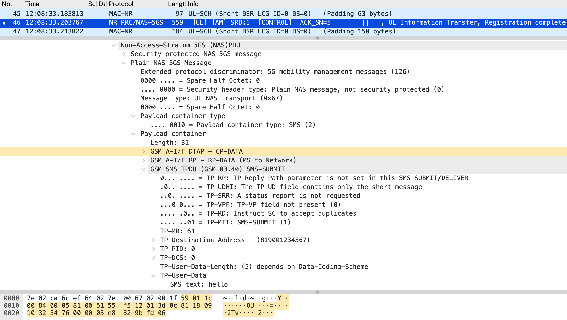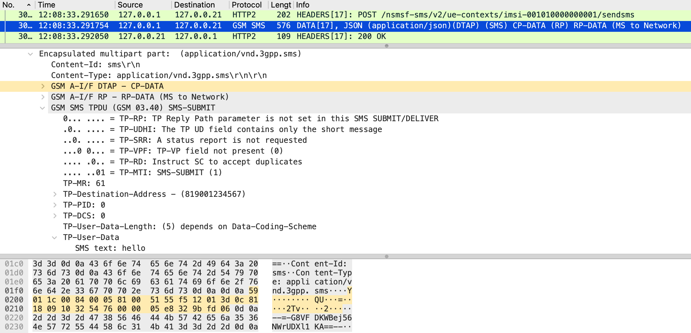 Next, the extended srsUE is confirmed to send SMS over NAS messages as expected. As shown in Figure 5, the srsUE loads the byte sequence representing the SMS PDU into the payload of the Uplink NAS transport message. In the captured Uplink NAS transport message, the byte sequence is interpreted as the SMS PDU, as shown in Figure 10. Furthermore, in the Nsmsf_SMService_UplinkSMS request from AMF to SMSF captured in the CN, the byte sequence matches as shown in Figure 11. Based on these results, it is concluded that the srsUE sends SMS over NAS messages as implemented.