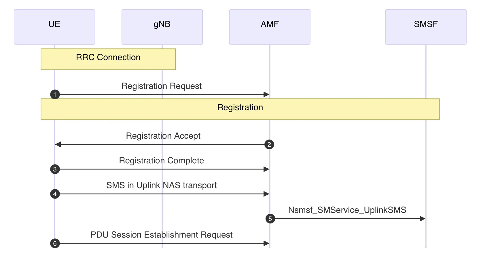 The srsUE has been extended to send SMS over NAS messages after completing the registration procedure with the CN. SMS over NAS is forwarded in the control plane, allowing UEs to send messages before establishing a data session. Figure 2 shows the sequence of the extended srsUE connection process. After establishing an RRC connection with the gNB, the srsUE sends a Registration Request message to the AMF (Step 1 in Figure 2). This triggers the AMF to authenticate the srsUE’s subscriber information and register it with the SMSF, as shown in Figure 8 of the previous article. The AMF then sends a Registration Accept message to the srsUE, and the srsUE responds with a Registration Complete message (Steps 2 and 3 in Figure 2). The srsUE then sends an Uplink NAS transport message loaded with an SMS PDU to the AMF (Step 4 in Figure 2). This step has been added by the extension.