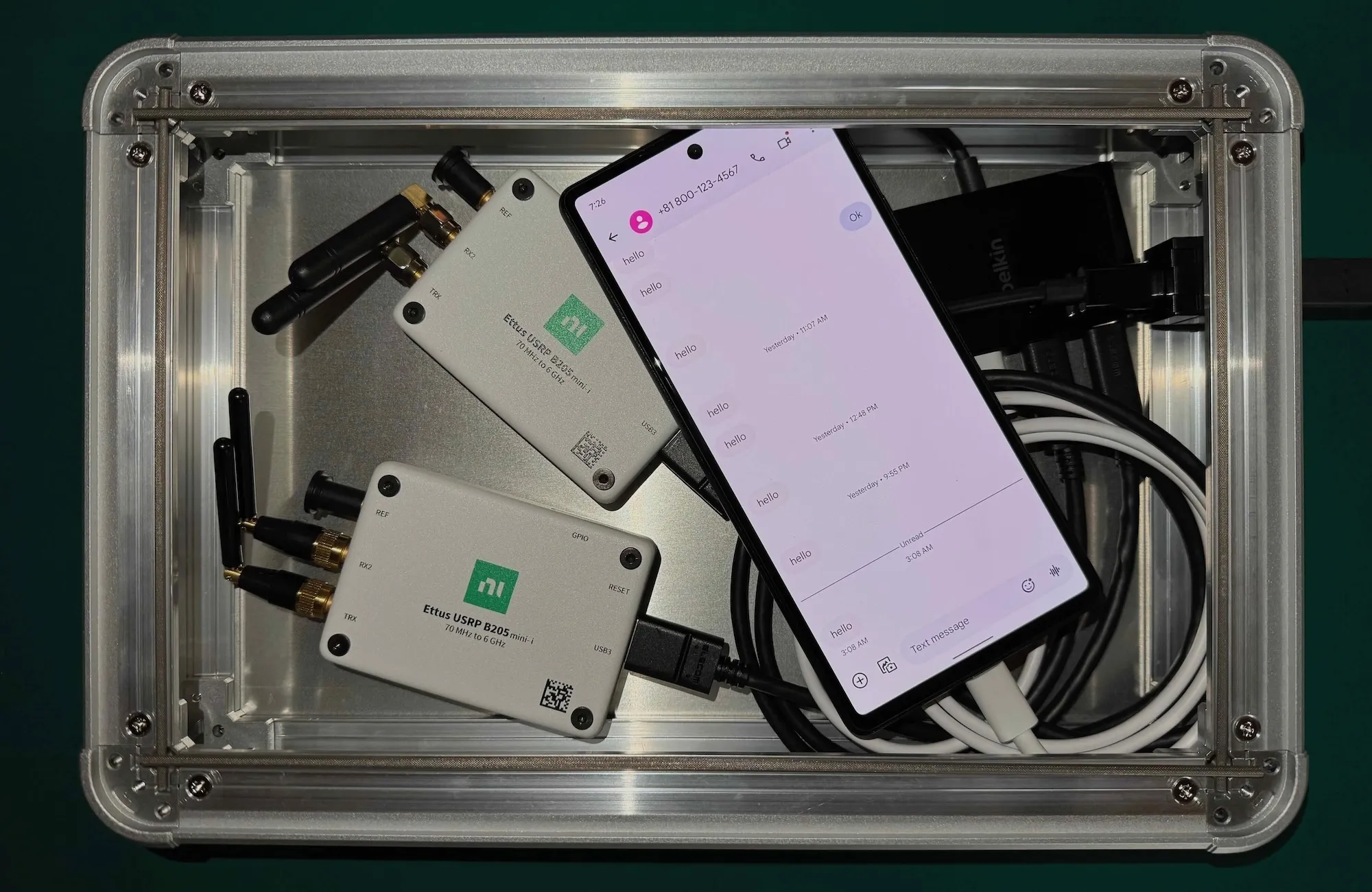 The extended srsUE was demonstrated on a private 5G mobile network. The demonstration reused the mobile network described in the previous article and the subscriber information shown in a different previous article. The srsUE was used as the sender of the SMS over NAS message and the Pixel 6 was used as the receiver. Therefore, the srsUE was assigned the IMSI 001010000000001 and the phone number 818001234567, while the Pixel 6 was assigned 001010000000002 and 819001234567. Two USRP B205mini-i⁶ were used as the radio hardware for the gNB and the srsUE. As shown in Figure 6, these devices were placed inside a shielded box during the demonstration.