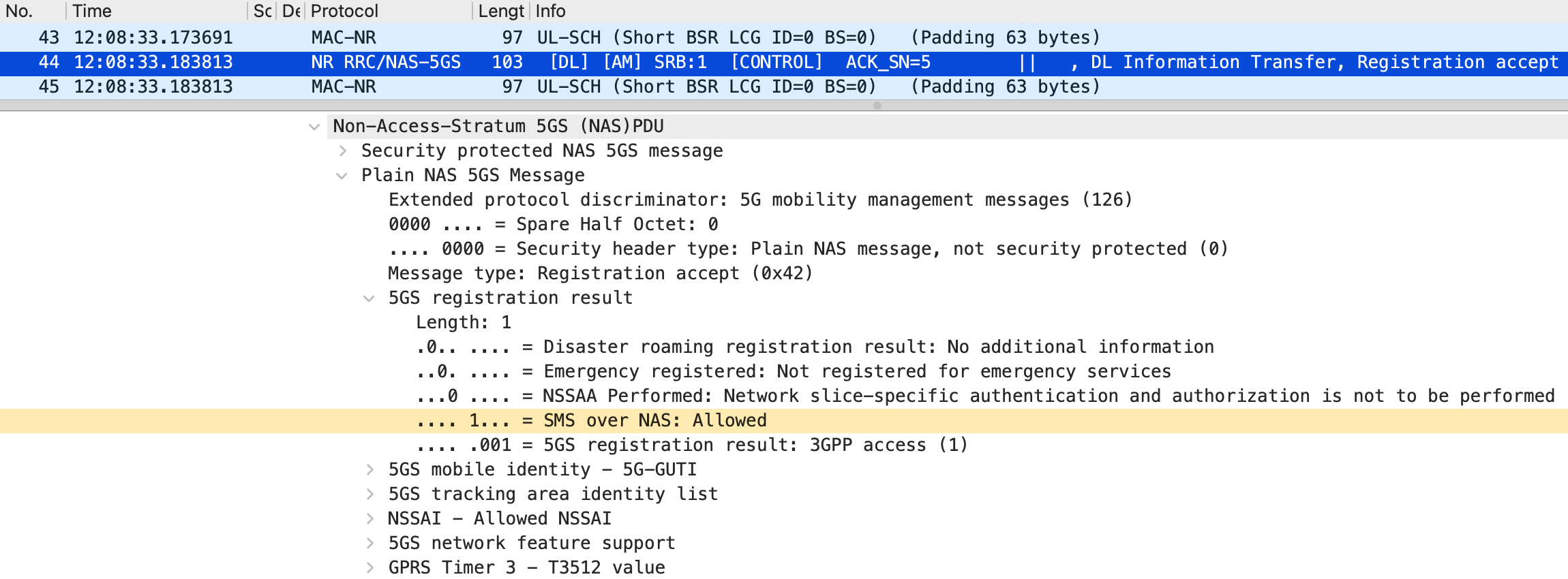 First, the extended srsUE is confirmed to support SMS over NAS. As shown in Figure 3, the srsUE has been modified to inform the CN that it supports SMS over NAS in the Registration Request message. In the Registration Request message captured on the srsUE, the 5GS update type element is set to SMS over NAS transport requested (SMS requested): Supported, as shown in Figure 8. Consequently, in the Registration Accept message, the 5GS registration result element is set to SMS over NAS: Allowed, as shown in Figure 9. These results mean that the extended srsUE is allowed by the CN to use SMS over NAS.